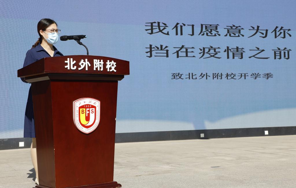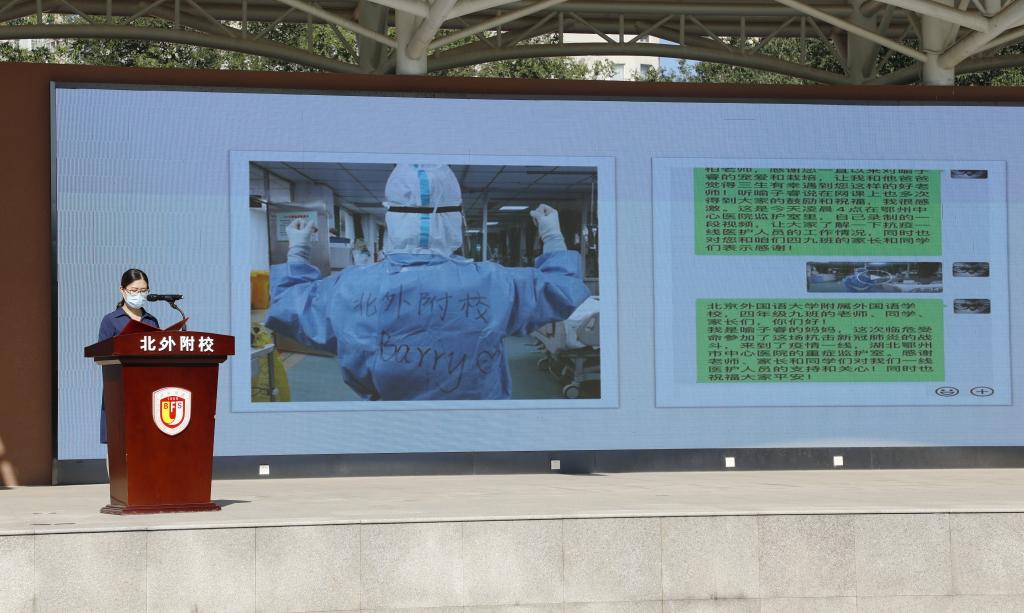 我校小学生家长代表——来自北大国际重症医学科的援鄂国家医疗队队员郭淼,和我们一起分享了她的抗疫日记。她鼓励孩子们勇敢面对困境,热爱家庭和祖国,要努力学习,未来在属于自己的岗位发光发亮。郭淼的演讲生动感人,在场师生无不热泪盈眶。