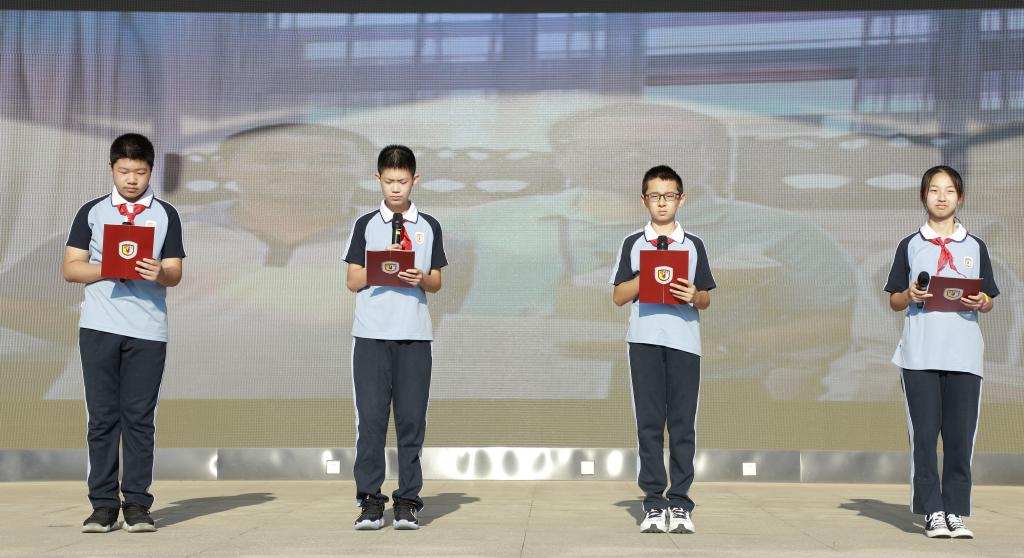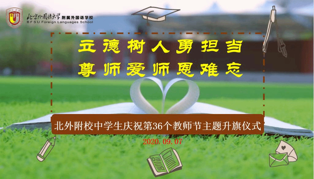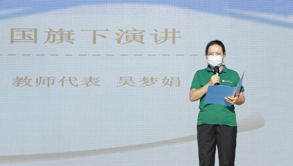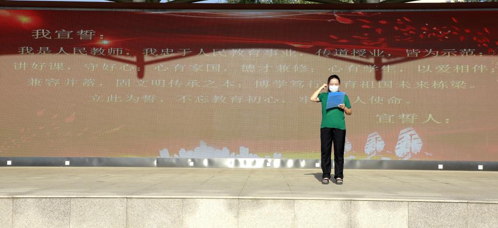 今年教师节的主题是: “立德树人奋进担当,教育脱贫托举希望”。百年大计、教育为本。教育扶贫是国家脱贫攻坚工作的重要组成部分。吴梦娟老师于2019年暑期参加了北京外国语大学老教授协会组织的支教活动--河北省青龙满族自治县暑期英语骨干教师培训活动。她进行了恳切的发言。作为教师,能够通过支教帮助贫困地区的学生改善教育,让她感受到了教师这个职业的伟大。对于我们这些在城市里生活的人们,也许支教只是一项经历,但对于那里的孩子们而言,支教也许可以助力他们更接近梦想。将来他们会带着梦想走出大山,用自己的双手创造未来、改变命运,彻底摆脱贫困。希望更多的教师可以加入到支教活动,为教育扶贫尽一份力!最后,吴梦娟老师带领全体教师庄严宣誓。铮铮誓词,永生难忘,不忘育人之初心,北外附校的全体教师努力争做“有理想信念、有道德情操、有扎实学识、有仁爱之心”的教师,做学生成长道路上的“领路人”。