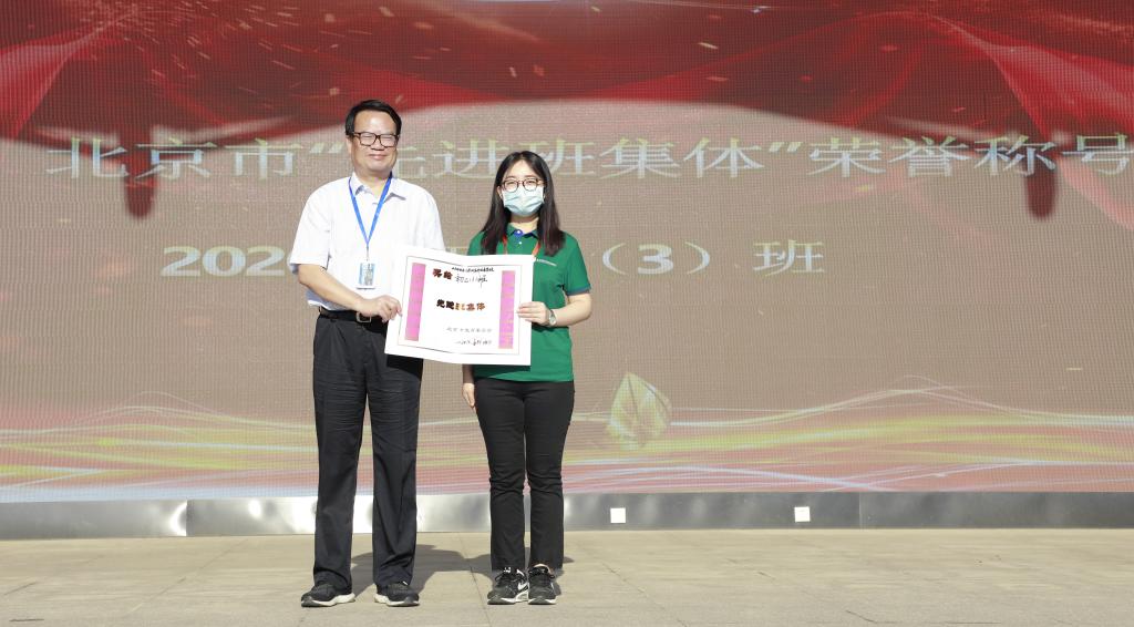 我校2020届初三(3)班在班主任王珊老师的带领下,通过全班同学的共同努力下,勤奋求实、团结创新,被北京市教育委员会授予2019—2020年度“先进班集体”荣誉称号,林卫民校长为获奖师生颁奖。
