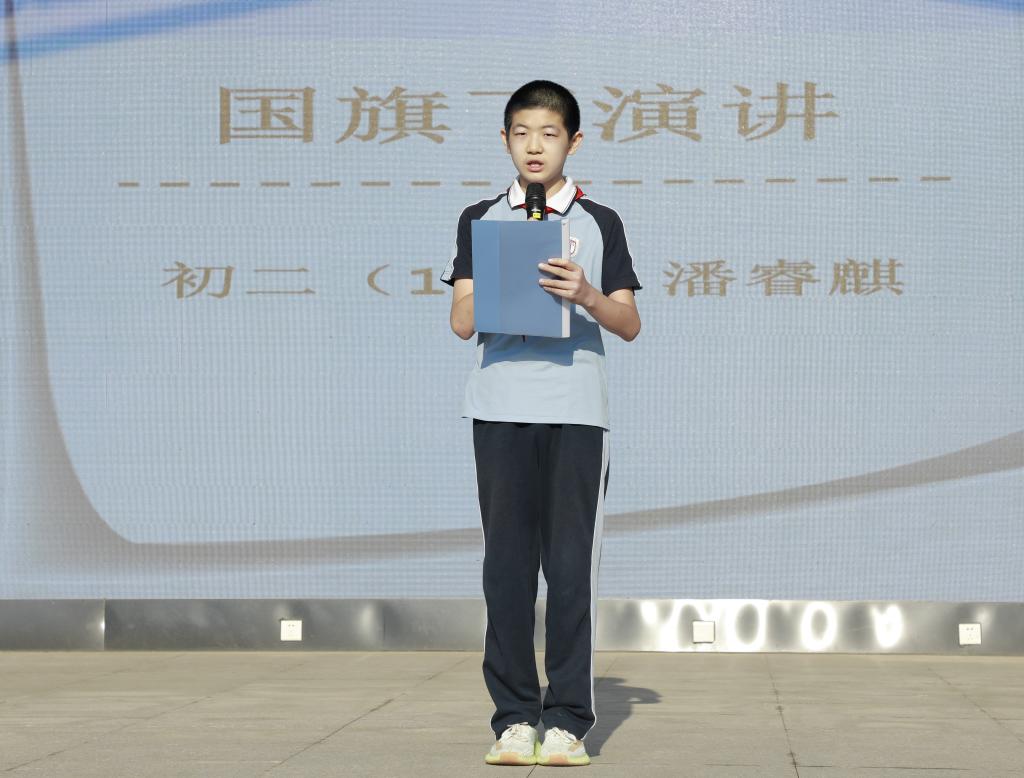 初二(1)班潘睿麒同学进行主题为《感念师恩,尊师重教》的国旗下演讲。他以程门立雪的故事呼吁同学们心怀对老师的感恩之心,在教师节来临之际,为老师们送上最真诚的祝福。他向同学们提出倡议,弘扬尊师重教、感念师恩的传统美德,从小事做起,遇见师长文明有礼,关心热爱老师;认真听好每一节课,完成好老师布置的每一项任务,用行动去影响身边的每一个人。