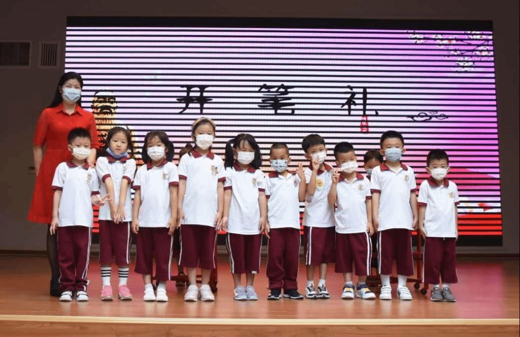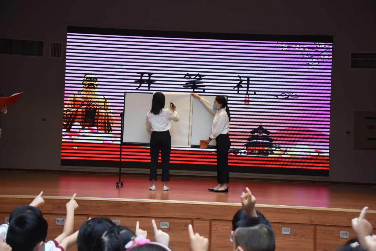 书法老师现场挥毫,在台上写书一个大大的人字,小朋友们伸出手指,隔空临摹,便是学会做人,心灵而神会于一笔一划之中。这“开笔礼”庄重而富有启智深意,台上台下浑然一体。