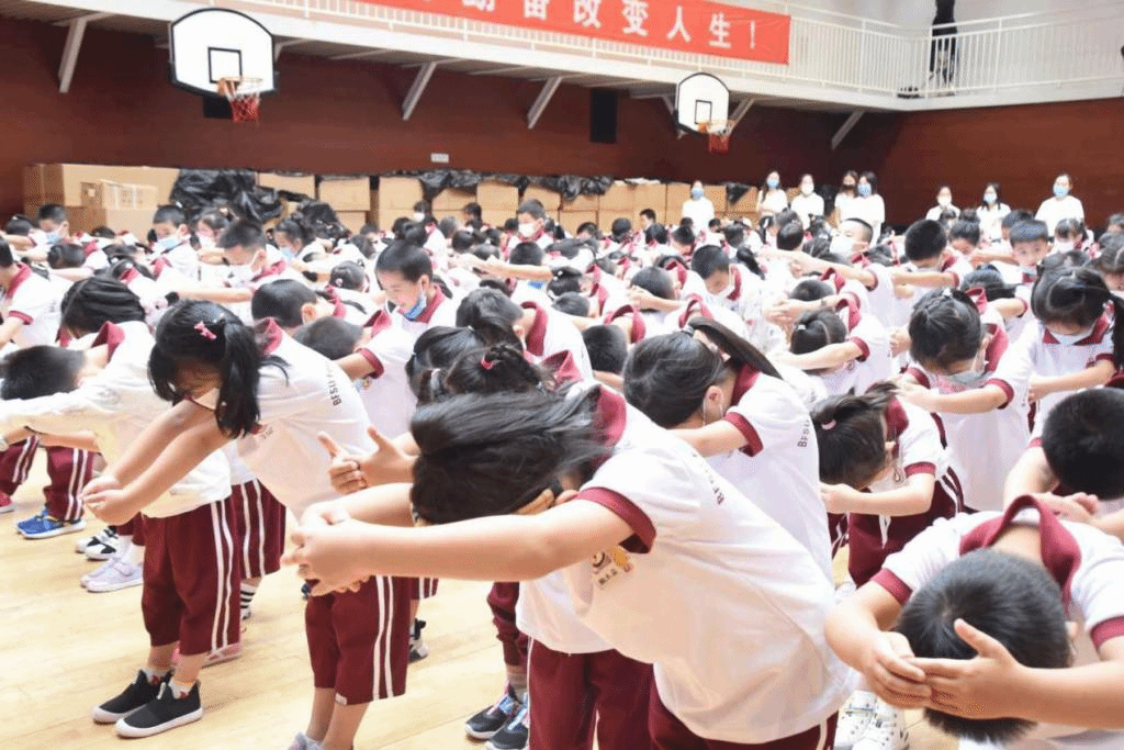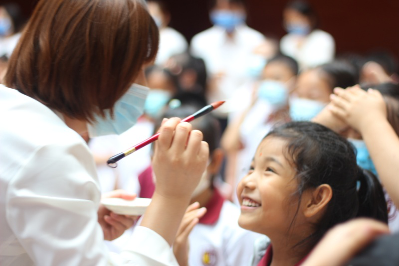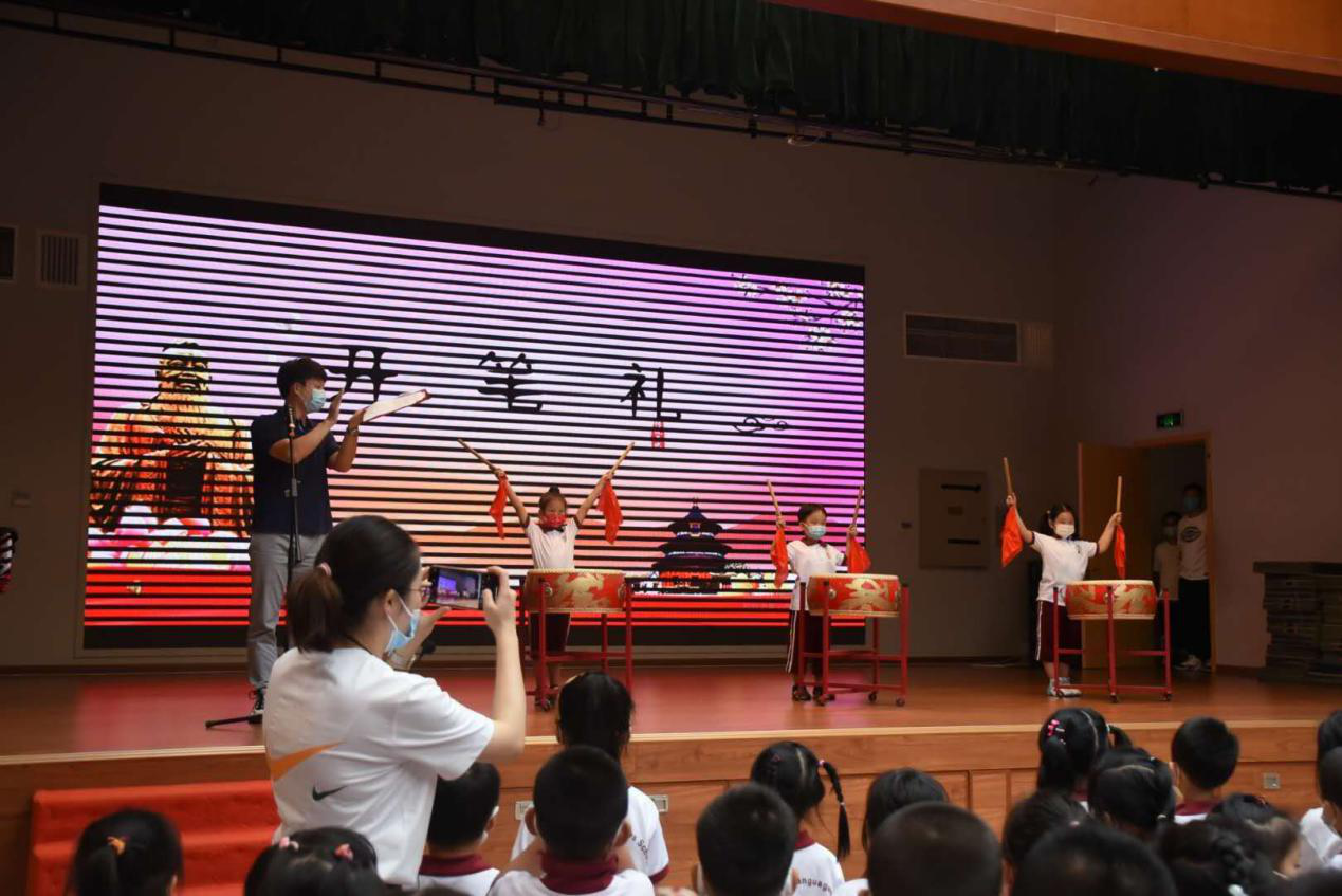 接下来,便是 “击鼓鸣志”、“朱砂启智”和“开笔礼”等充满古韵的仪式。台上鼓点起落,台下士气昂扬;台上刘校长面带微笑,朱砂圆润,在学生代表眉间润泽智慧,台下10位班主任朱砂起落,挥毫或轻盈或郑重,仿佛正在醍醐灌顶,而小朋友们懵懂也欢乐。