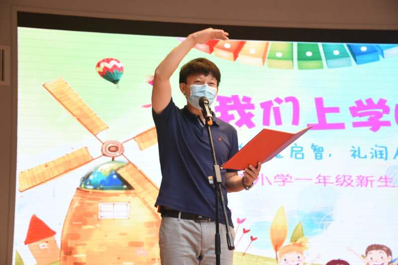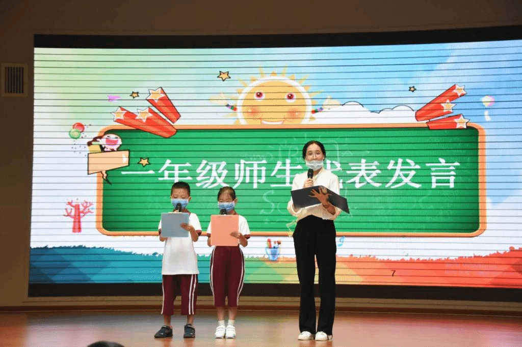 最后,师生代表台上发言,表达对小学生活的寄托和畅想,然后台下的小朋友郑重宣誓,纷纷立志要做一名文明有礼、积极向上的小学生。