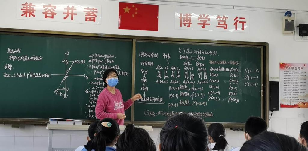 10月15日,我校初中数学组教研组长宋宗伟老师在初三(1)班给学生们上了一堂《关于原点对称的点的坐标》的公开课。宋宗伟提出回忆图形变换的研究思路,首先要明确研究方法,通过定义——探索性质——作图——用坐标表示图形的变换,让学生明确目标和方法。在教学过程中,她设置开放性问题,让学生顺理成章想到旋转,用坐标表示点的旋转需要考虑从特殊的旋转入手,即研究关于原点对称的点的坐标的规律,让学生体会数形结合、有特殊到一般、转化等数学基本思想方法。