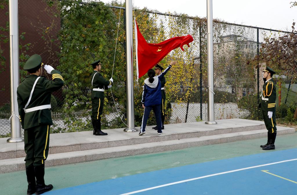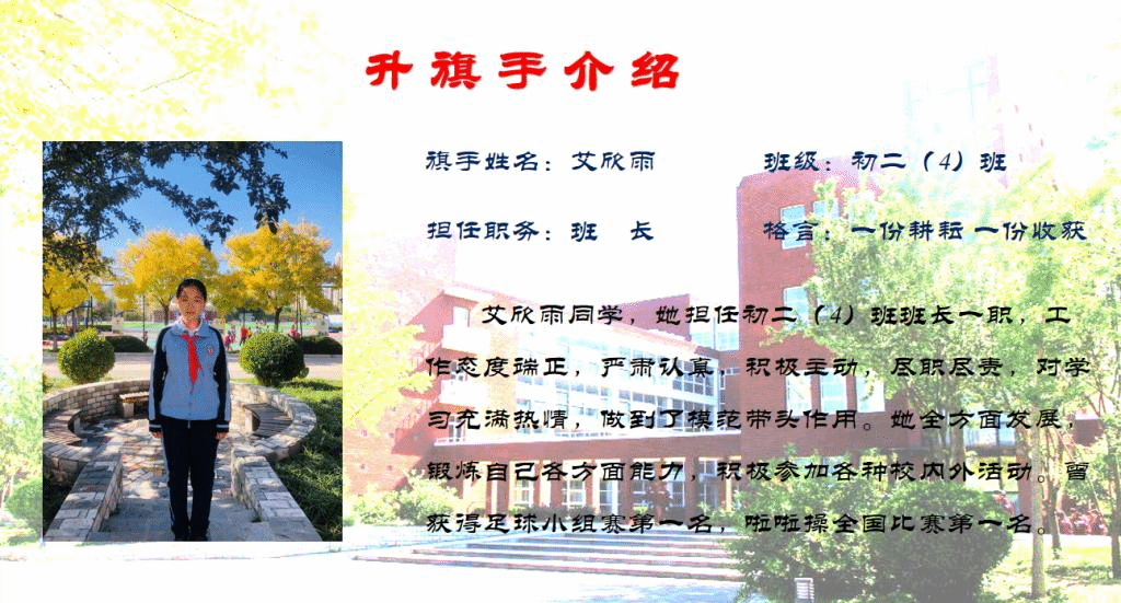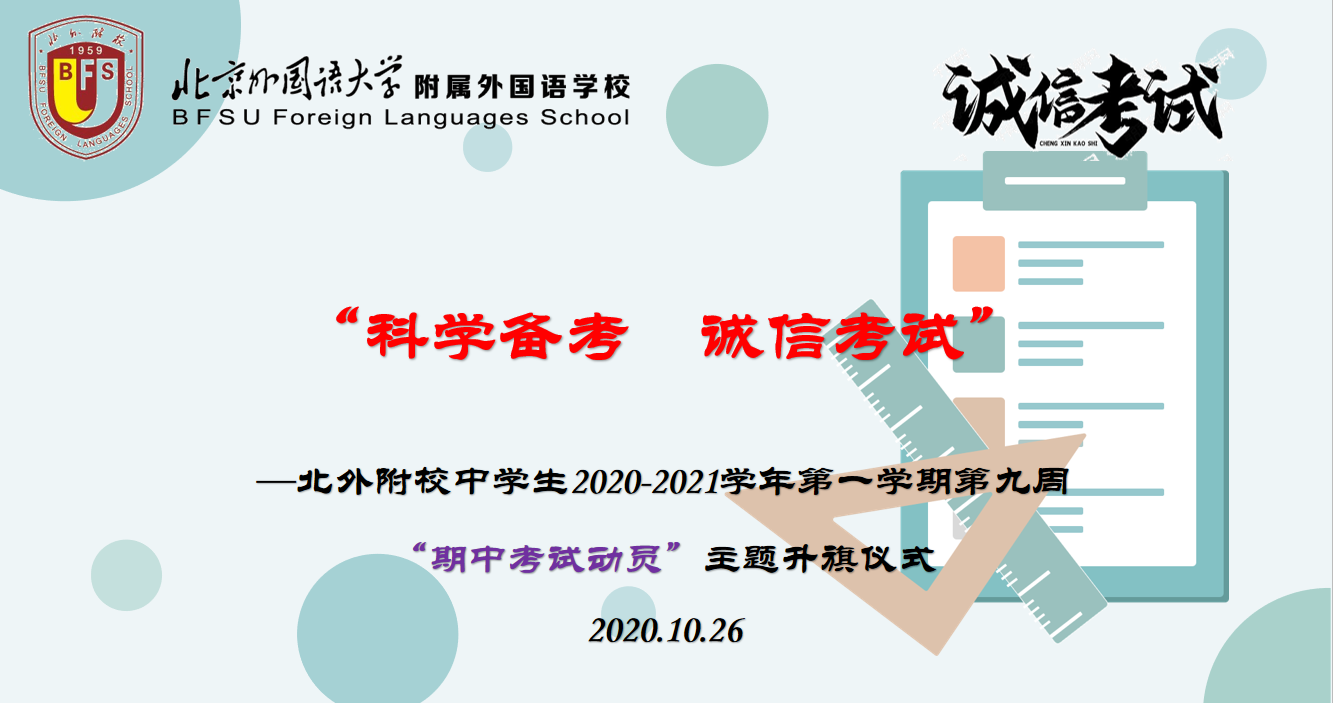 10月26日,我校举行2020—2021学年度第一学期中学生第九周“科学备考,诚信考试”期中考试动员主题升旗仪式。主持升旗仪式的是初二(4)班的薛一莹和黄思齐同学,升旗手是艾欣雨同学。