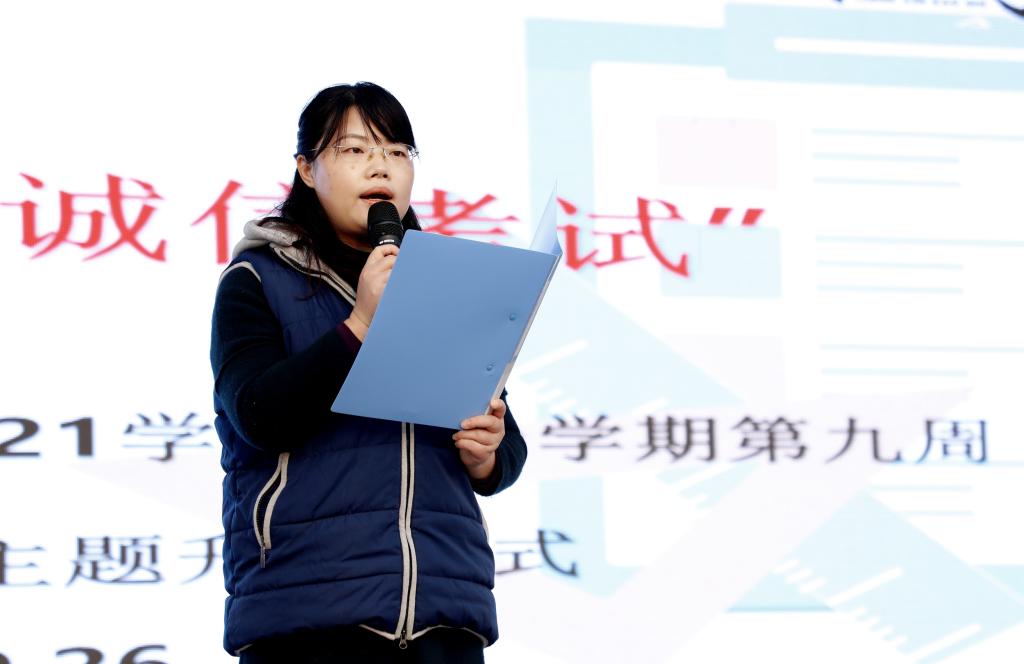 其后,初二(4)班张珈源同学进行了“诚实考试 诚信做人”主题演讲。她引用古诗古文,表明诚信是中华民族的传统美德,并向全体同学提出诚信考试的倡议,号召大家积极备考,遵守纪律,相互督促,弘扬正气,以诚信考试为荣,以违纪作弊为耻。最后,她预祝同学们在期中考试中取得优异成绩。
