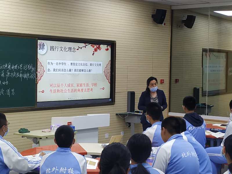 10月29日下午第8节,在录课室,刘凤琴老师上了《延续文化血脉》这一课题。刘老师充分利用学生身边的资源,从学校的校训和各种路的命名,拉近学生和文化课题的距离,让学生感受到文化就在身边。利用了丰富的资料展示了中华文化的魅力,让学生认同中华文化,树立文化自信。最后利用了汉语桥视频让学生分析如何践行文化自信,落到实处。