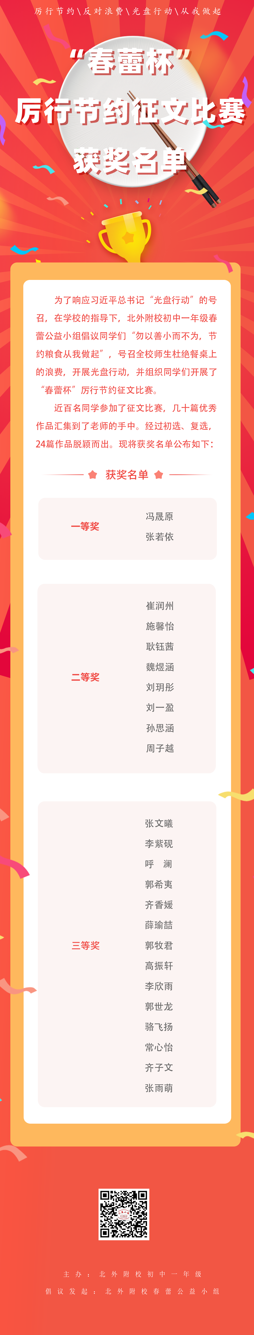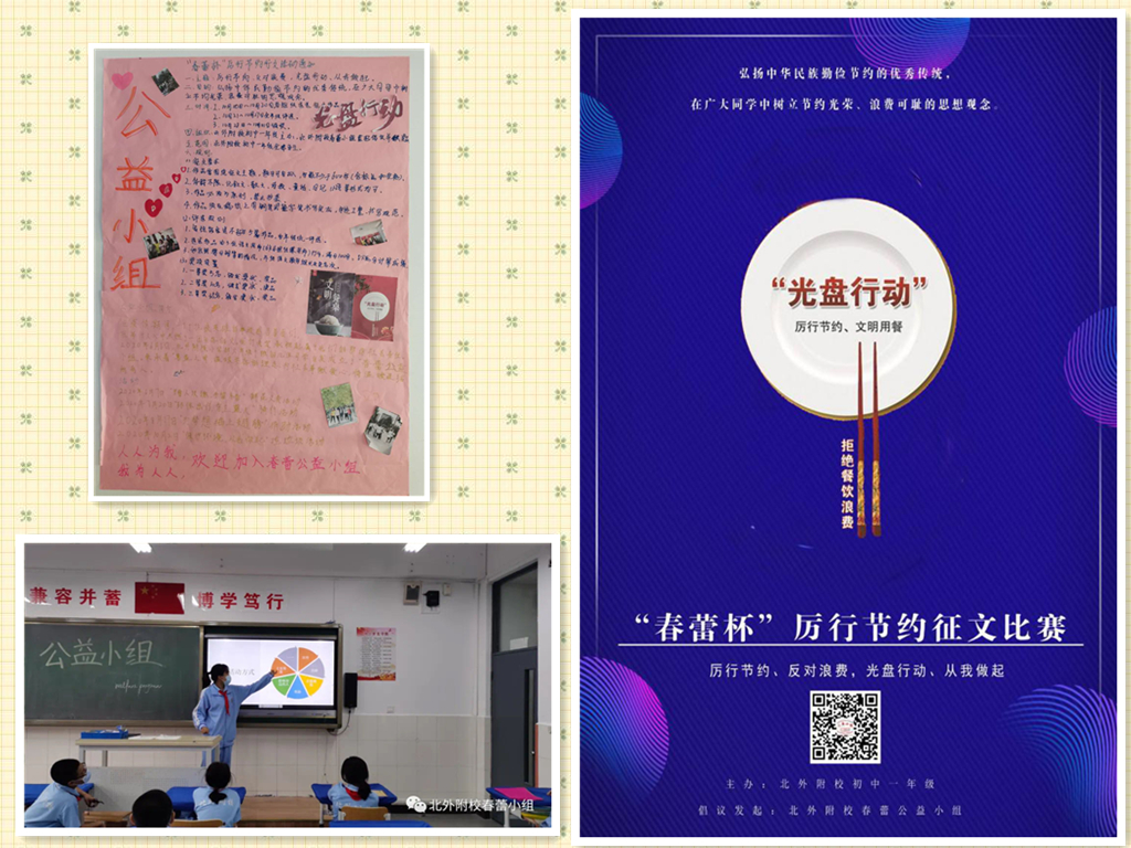 2020年1月,习近平总书记号召全国人民大力弘扬中华民族勤俭节约的优秀传统,厉行节约、反对浪费。为响应号召,全北京市各中小学的同学们纷纷行动起来,共同践行节约粮食、从我做起的誓言。北外附校的同学们也不甘落后,在学校的指导下,初中一年级春蕾公益小组倡议大家“勿以善小而不为,节约粮食从我做起”,号召全校师生杜绝餐桌上的浪费,开展光盘行动,并组织同学们开展了“春蕾杯”厉行节约征文比赛。