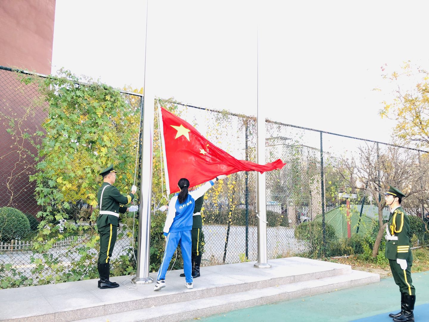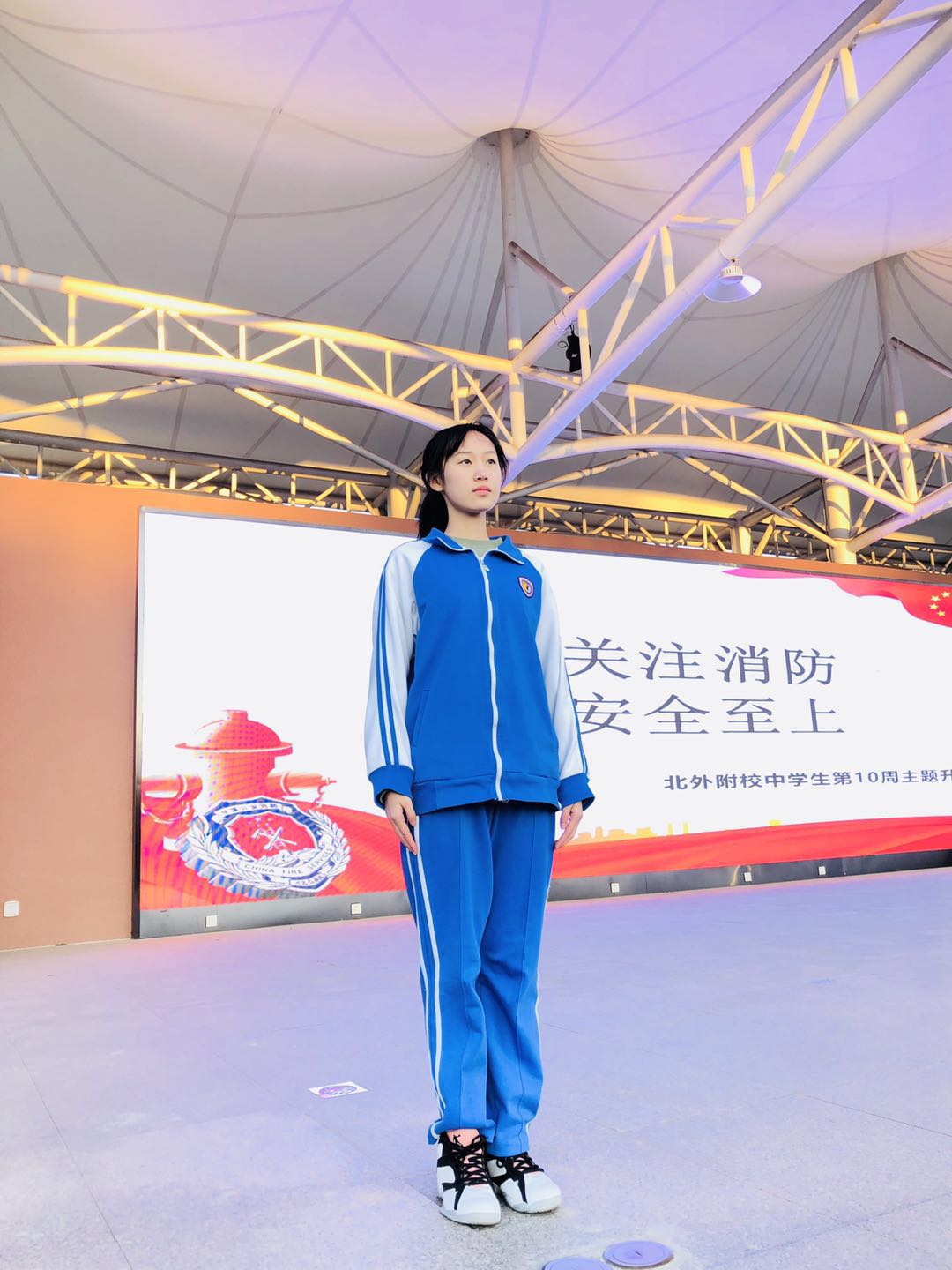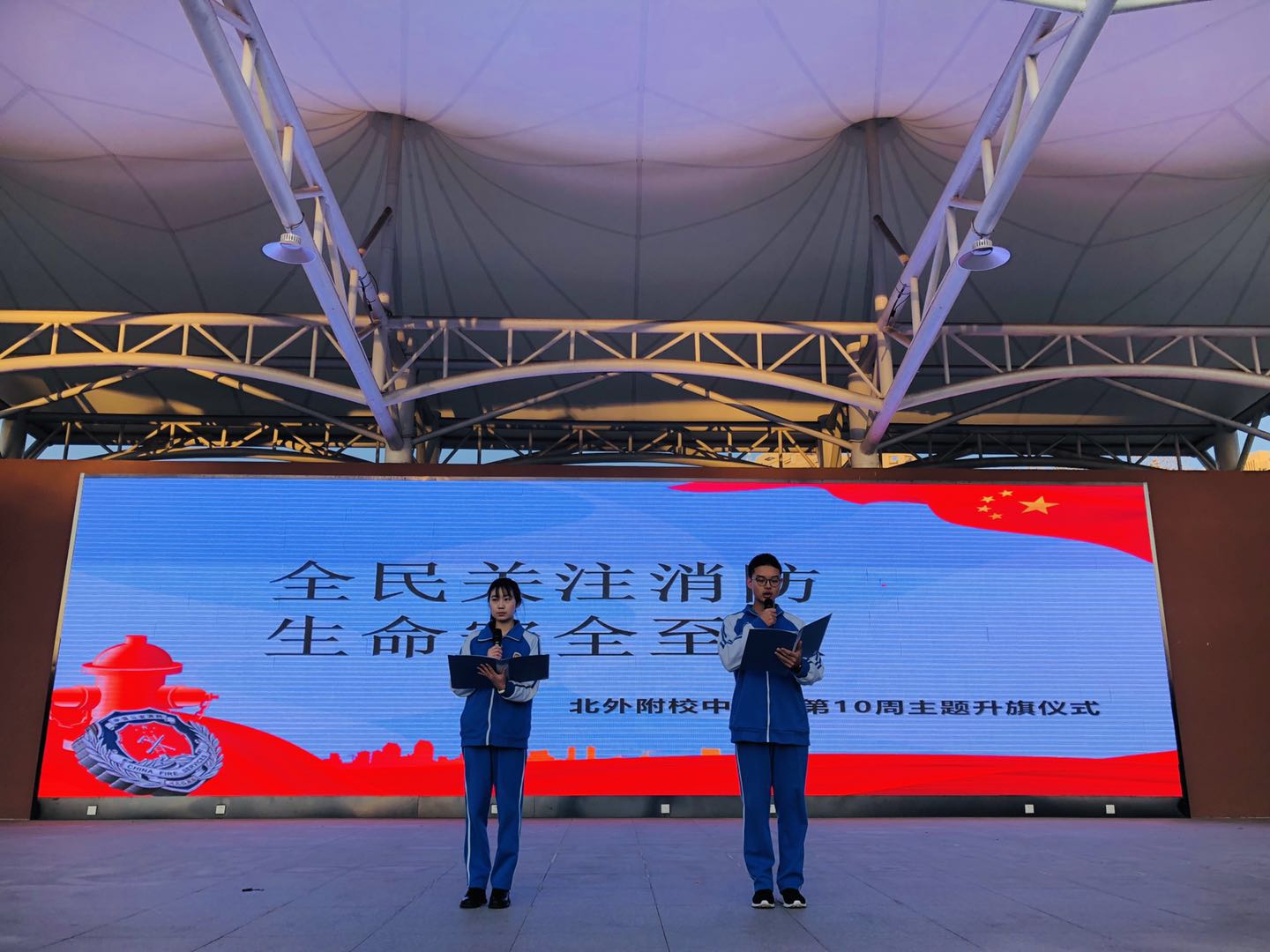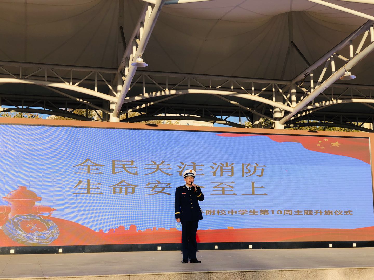 为加强中学生消防意识,从根本上避免校园火灾事故的发生,11日2日我校举行第十周“全民关注消防,生命安全至上”中学主题升旗仪式。负责本周升旗仪式的是高二(4)班,升旗手是郭卓玥同学。