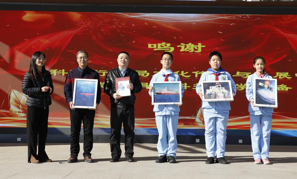 为助力我校科技创新教育教学的高质量发展,中科院行管局科学文化传播发展中心向我校捐赠一批教学设备。我校副校长高雁鸣以及学生代表上台接受赠礼,我校也将60年校庆纪念手册珍藏版以及国家督学、研究员、我校校长林卫民的著作作为礼物回赠。