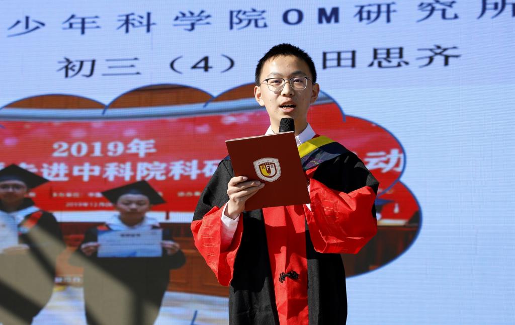 2018—2019年度海淀区“科技之星”获得者、海淀区少年科学院OM研究所小院士,我校初三(4)班 田思齐作为学生代表发言。他以一个中学生的视角畅想科技与未来,并结合所参加的OM比赛(OM 是Odyssey of the mind,一项培养青少年创造力的国际性比赛)经历向同学们讲述了如何将自己的兴趣爱好和知识技能运用到解题实践中。