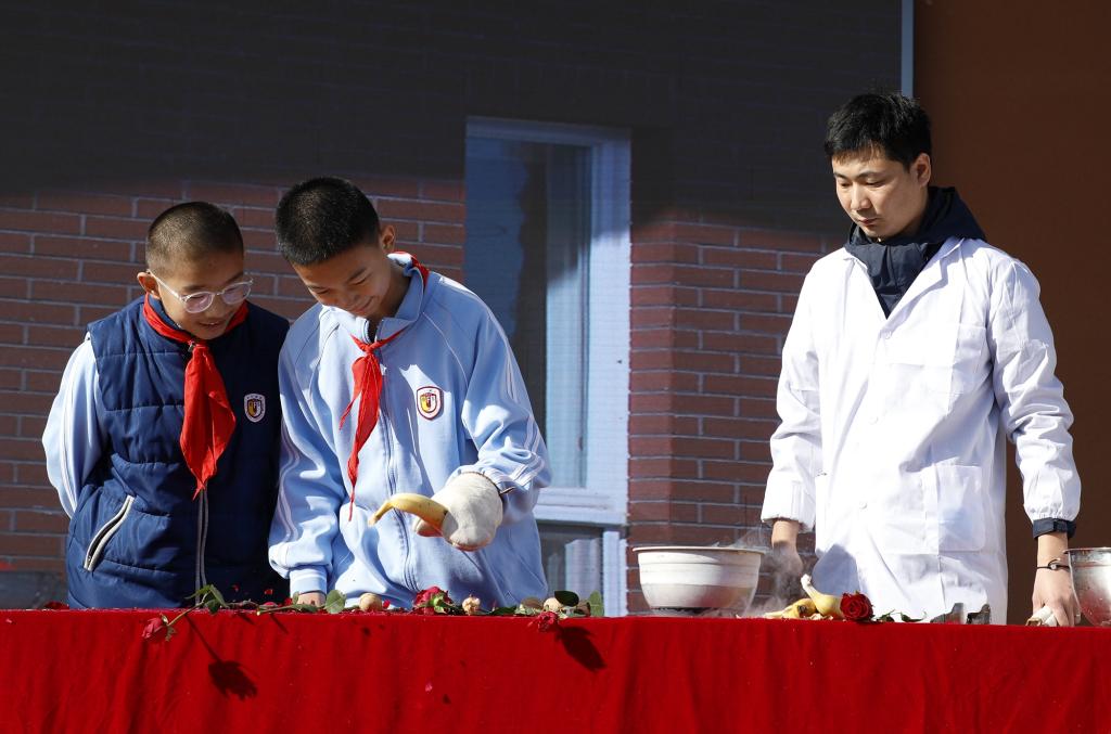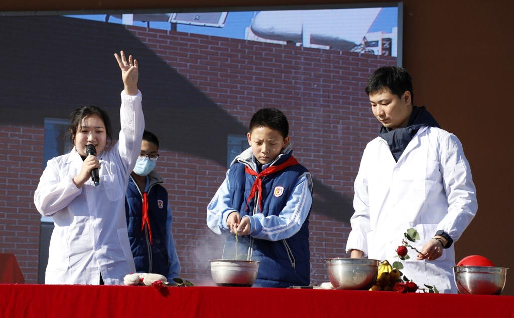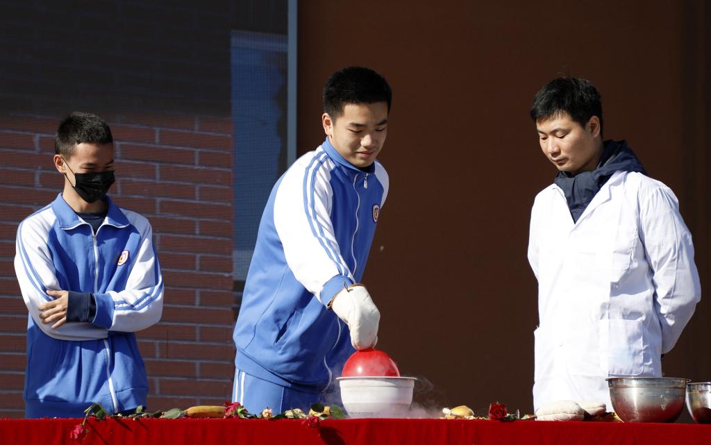 说起科学,人们想到的往往是高深莫测的公式和严谨的实验。而本次开幕式同学们看到的是一场别开生面的“科学表演秀”。可爱的机器人“三宝”是今天的特邀嘉宾,与主持人共同见证了液氮实验让玫瑰花花径变得坚硬无比,让玫瑰花瓣用手一碰就变成粉末。同学们和老师们上台亲身体验了神奇的实验,并了解了这其中蕴含的科学道理。演出结束后,在场师生用雷鸣般的掌声向科学研究院的老师们表达感谢。