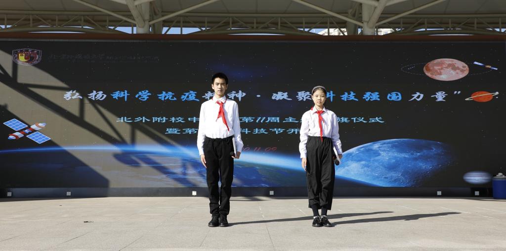 11月09日上午,我校召开中学生第十届科技节开幕式,本届科技节主题是“弘扬科学抗疫精神,凝聚科技强国力量”。初一(4)班李佳莹和初二(10)班杨天啸同学担任开幕式中英双语主持人。