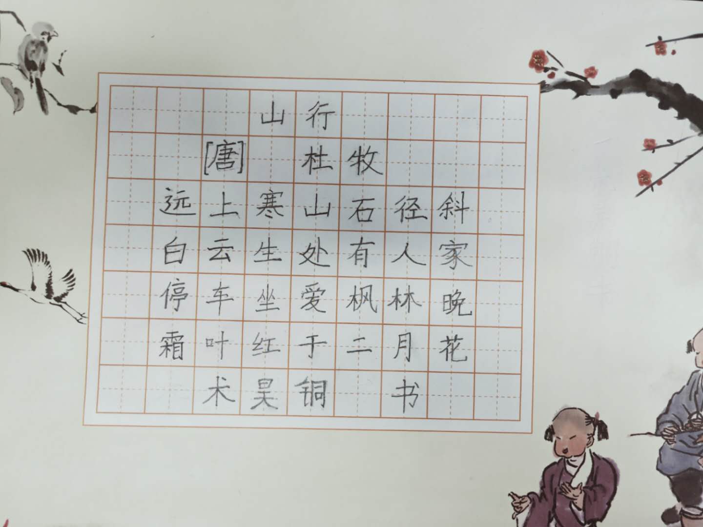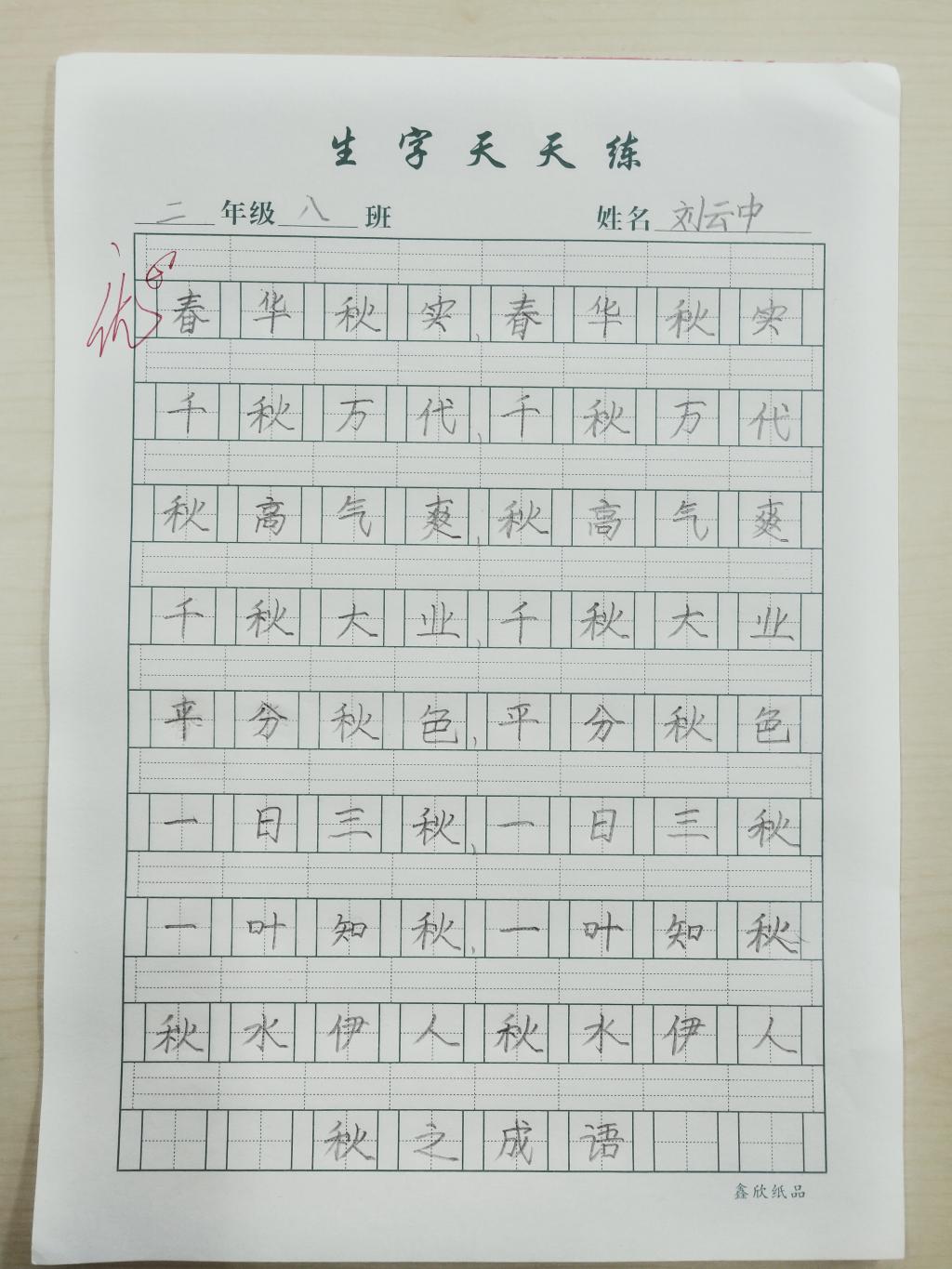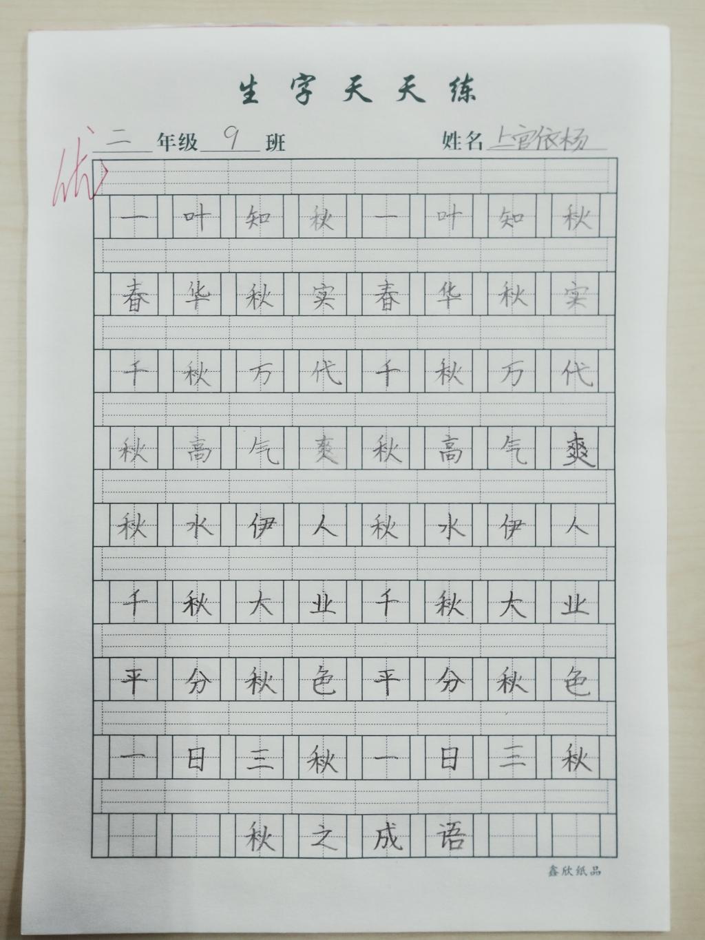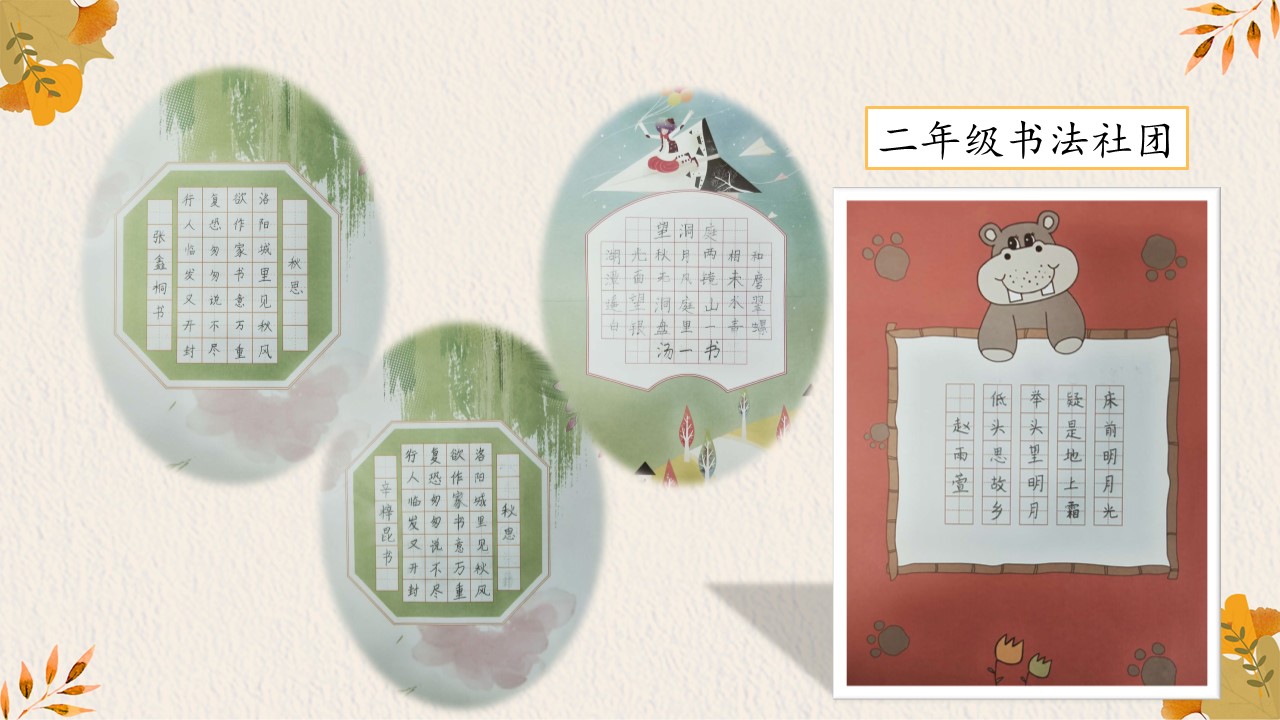 社团课的书法,展示的有低年级的硬笔书法和中高年级的软笔书法。书法,极具中国特色的汉字书法艺术。他们提笔写字书秋,专注写诗抒情——一片片落叶,一个个金秋,一首首秋诗,“野旷天低树,江清月近人”、“空山新雨后,天气晚来秋”、 “洛阳城里见秋风,欲作家书意万重”、“停车坐爱枫林晚,霜叶红于二月花”……