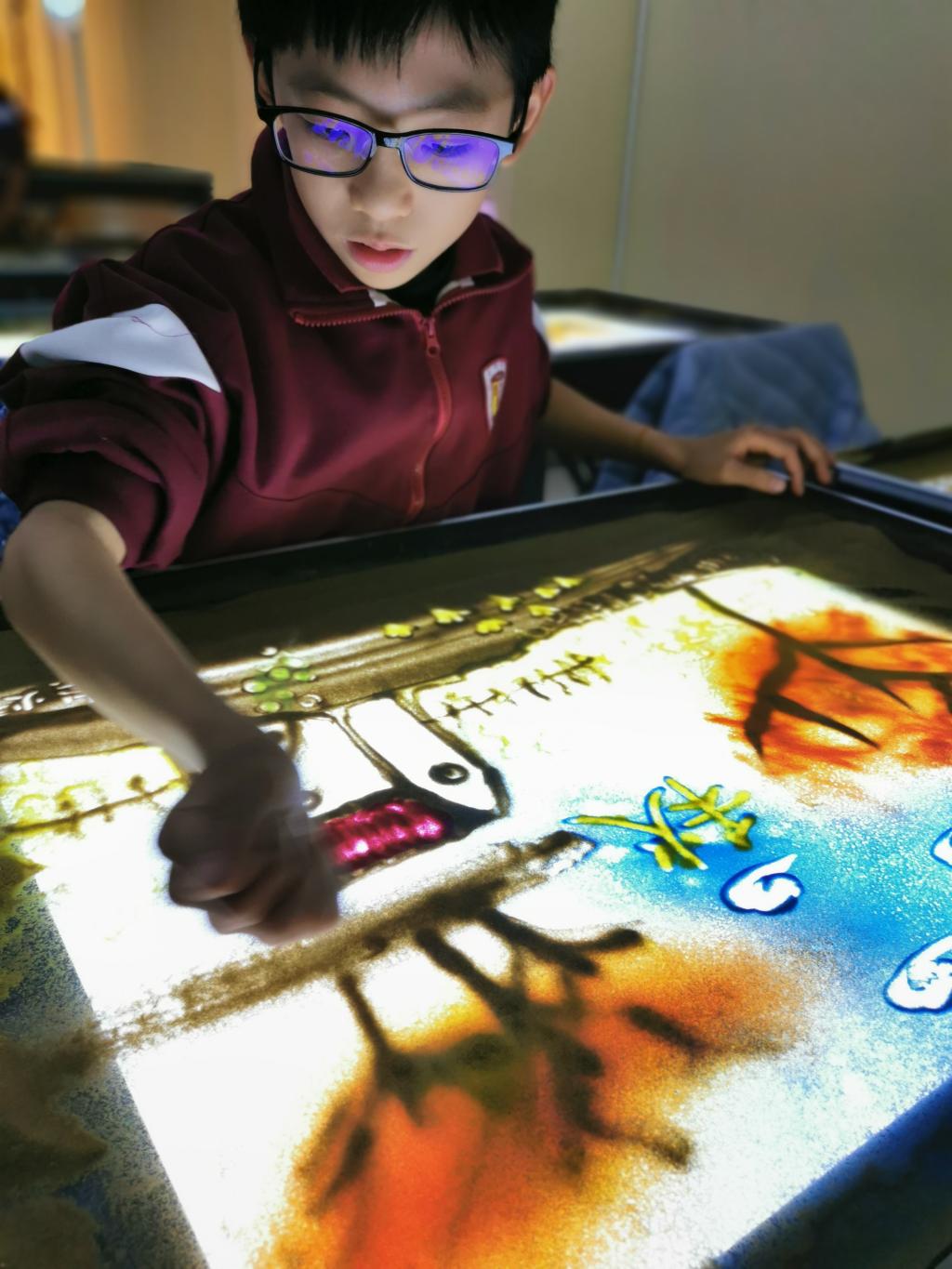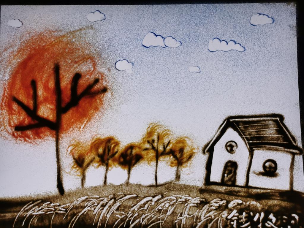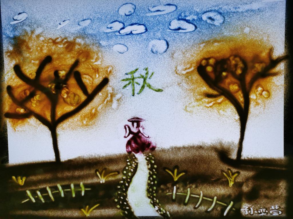 室内的沙画:秋天、白云,秋树、秋叶,秋风、秋水……一步到位,一气呵成,意境悠远,秋美尽显,变化万千—— “枯藤老树昏鸦,小桥流水人家,古道西风瘦马……”