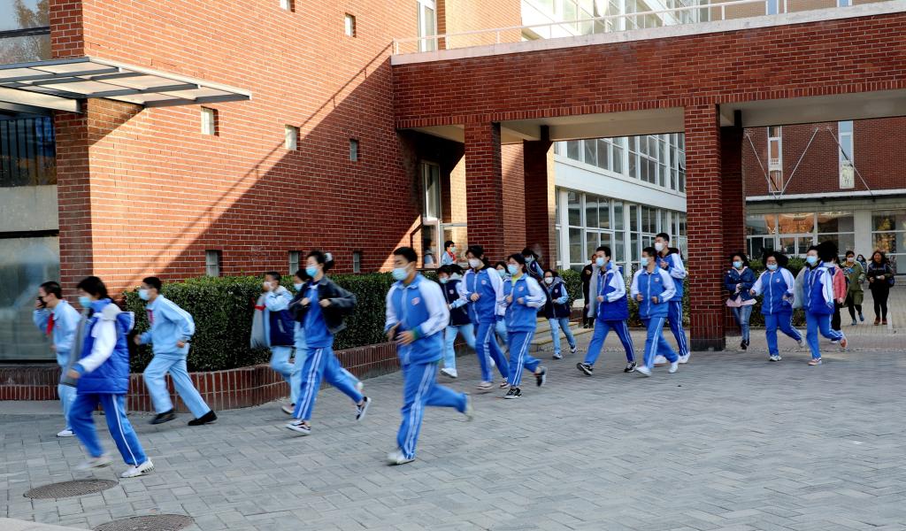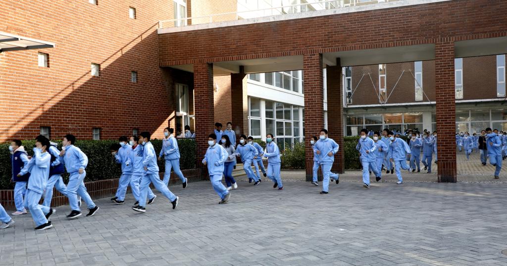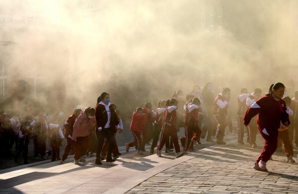 上午9点33分,随着校园警报的急促声响起,应急疏散演习正式开始。师生按照指定路线,弯着腰,用手、袖口捂住嘴鼻迅速有序地紧急撤离。4分30秒之内,全校共3667名学生全部到达操场指定位置,经各班清点人数,确认全部学生安全撤离。疏散过程秩序井然,达到预期效果。