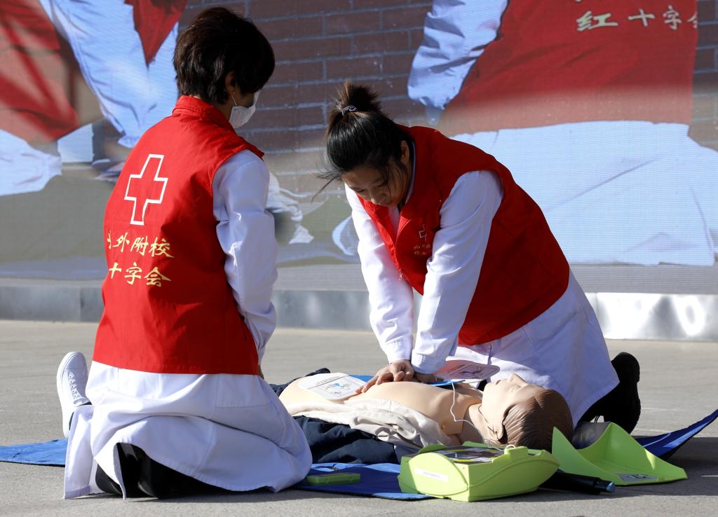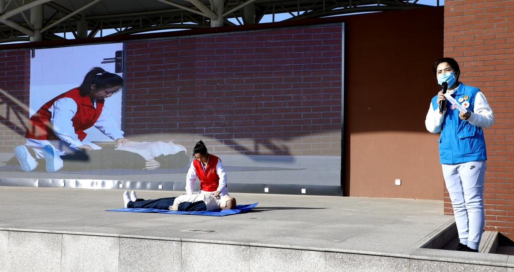 消防演练结束后,我校宿管中心李洪杰主任和医务室陈医生为全校师生演示、讲解了心肺复苏应急救治流程。主席台上,模拟情景逼真,同学们认真学习救治过程,老师通过确认现场环境、判断患者意识、高声呼救、胸外心脏按压、人工呼吸等环节清晰的演示了心肺复苏的救治方法。