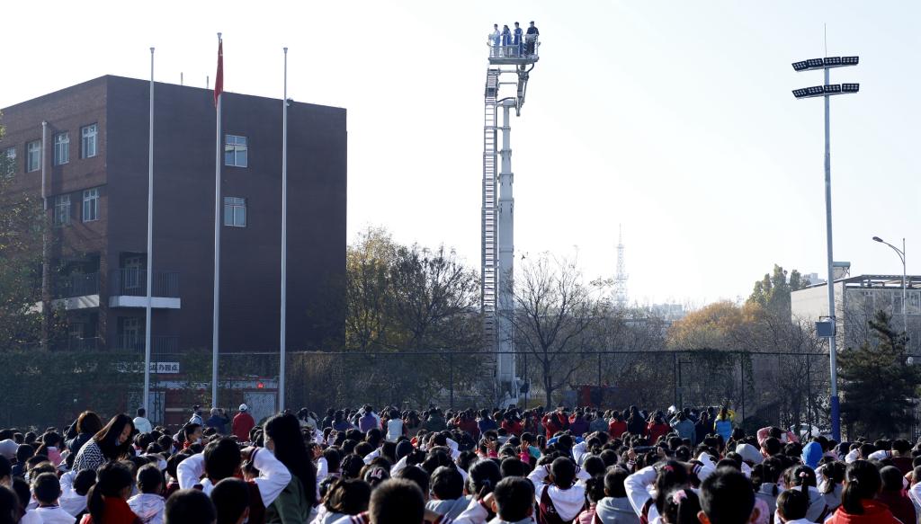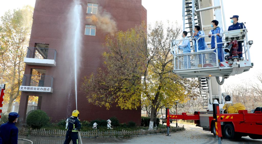 随后,西二旗消防救援站开展了高层建筑消防救援实战演练。小教楼模拟着火场景,消防战士用高压水枪迅速控制了火势。中学生代表还参与了高空云梯车救援体验,学生们真实地了解消防救援的流程。