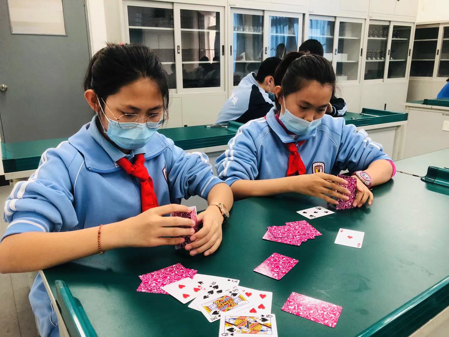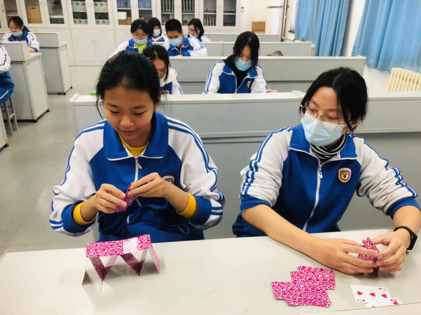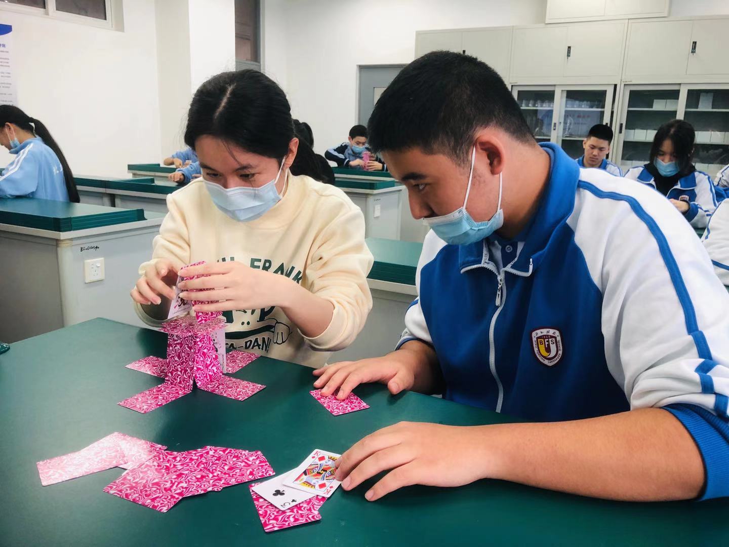 11月12日,我校中学生在物理实验室进行了激烈的纸牌搭塔比赛。共有初、高中组别二十一队参赛。比赛规则为:每两人组成一个队伍,限时十分钟,最后高度最高者获胜。期间如有倒塌可重复开始,不限次数且不可借助外力。