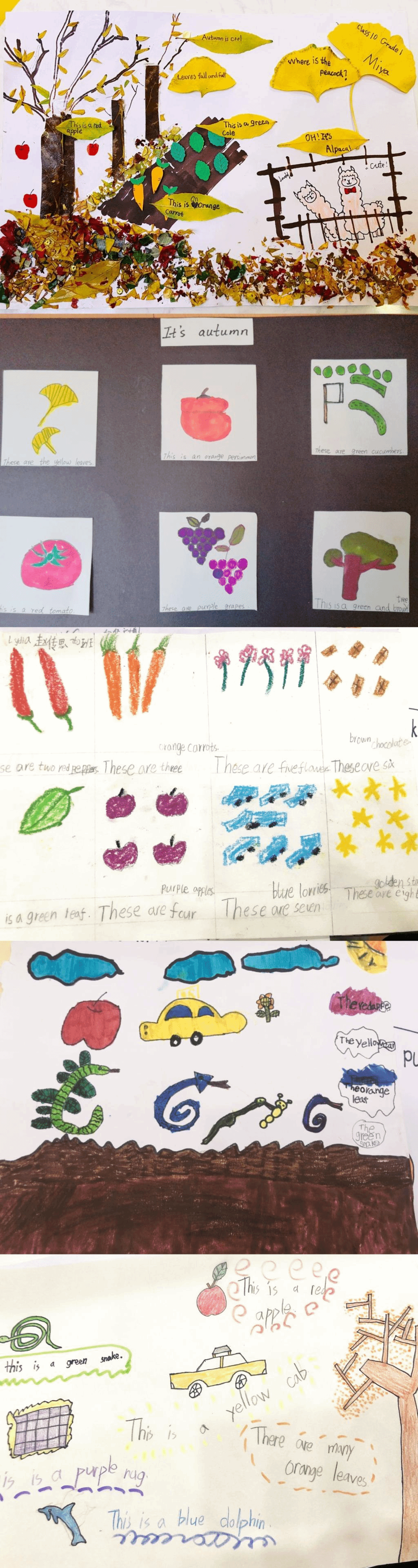 活动结束后,学生把自己观察到的事物通过制作绘本、叶画、手抄报等方式进行展示,用五彩缤纷的颜色呈现出所见所闻。通过本次活动,一年级的学生对于阅读和创作有了更进一步的理解,对英语学习充满兴趣。