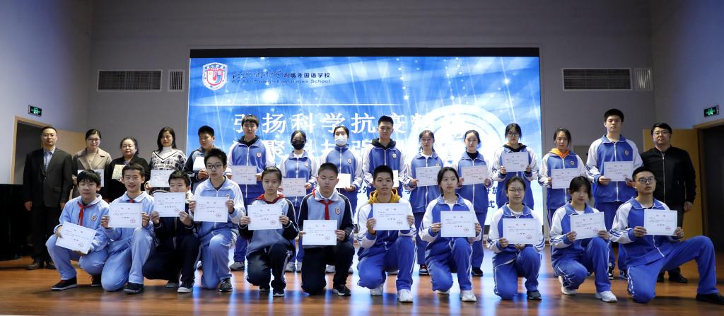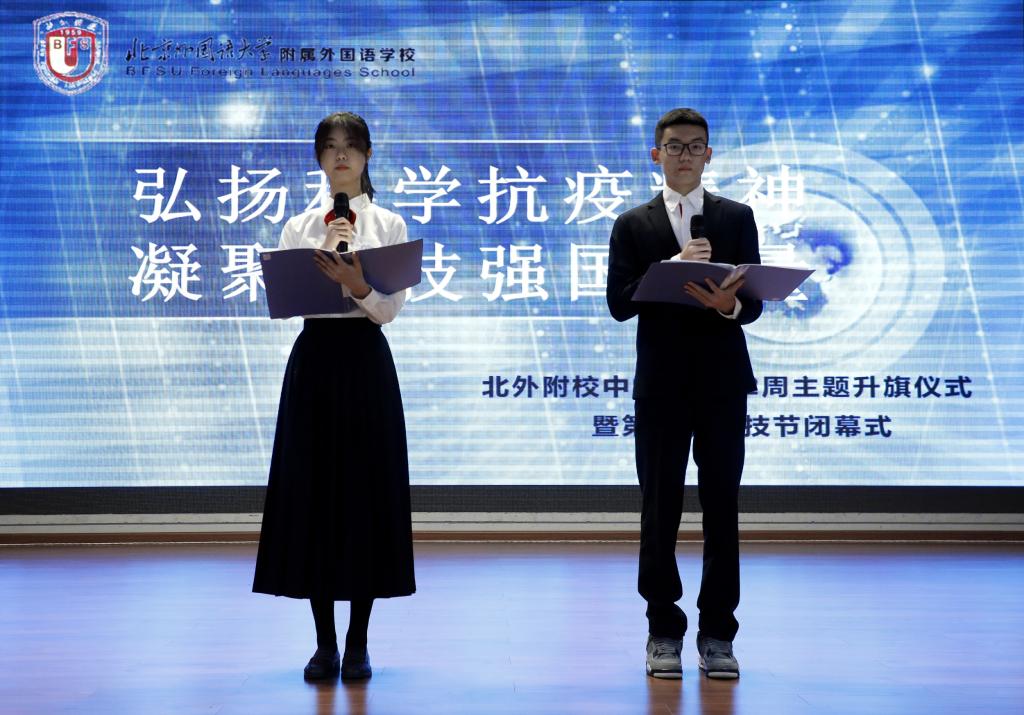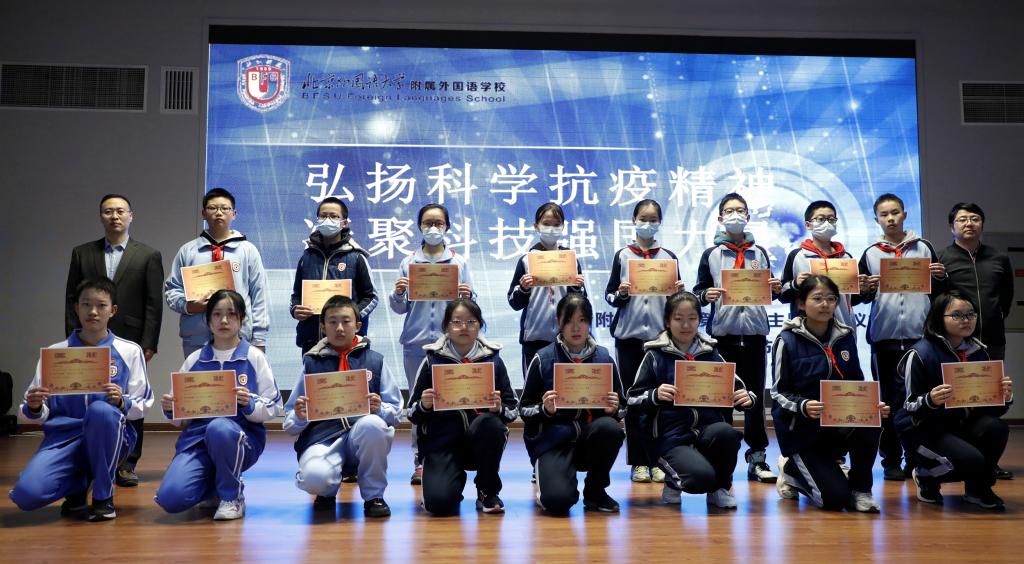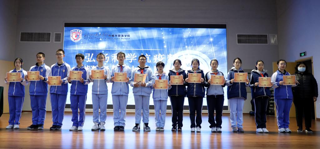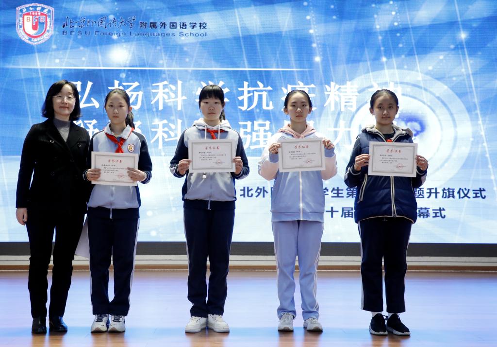 在升旗仪式的最后,副校长于苒、高雁鸣、杨磊分别为在本届科技节活动中荣获“优秀班集体”的班级—初一年级4班、6班;初二3班、7班;高一年级1班、2班;高二年级1班、2班;高三年级2班;为荣获“科技之星”称号的优秀学生们—初一年级张佳田、田雨竹;初二年级苏家林、赵子阅;初三年级田思齐;高一年级左益宁、焦司南;高二年级叶佳一、冯浩洋;高三年级卢冠文颁奖。高中执行校长王静分别为在2019年北京市中小学生天文知识竞赛中获奖的同学们颁奖。其中李思睿同学荣获北京市一等奖;张佳田、仝向麟、朱颢然、王琪同学获得北京市二等奖;张家越、周佳惠、王睿嘉、黄馨瑶、刘芯雨、王铭萱、陈诗漪、靳佳艺、刘禹涵、李雅文、刘咏熙、李佳麒同学获得北京市三等奖。另外科技节期间组织了各类科技比赛活动,在科技知识竞赛、纸飞机竞赛、纸结构承重、纸牌搭塔、DI万人挑战赛等活动中,各班同学都有所收获,高中学生共有47人获奖,初中学生共有58人次获奖。
