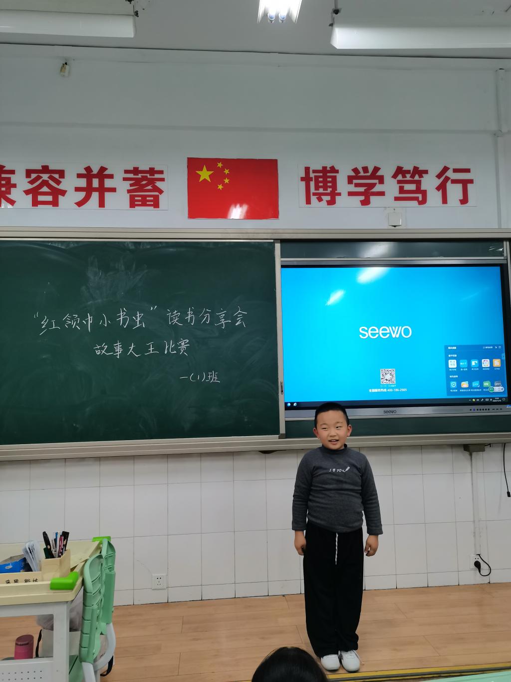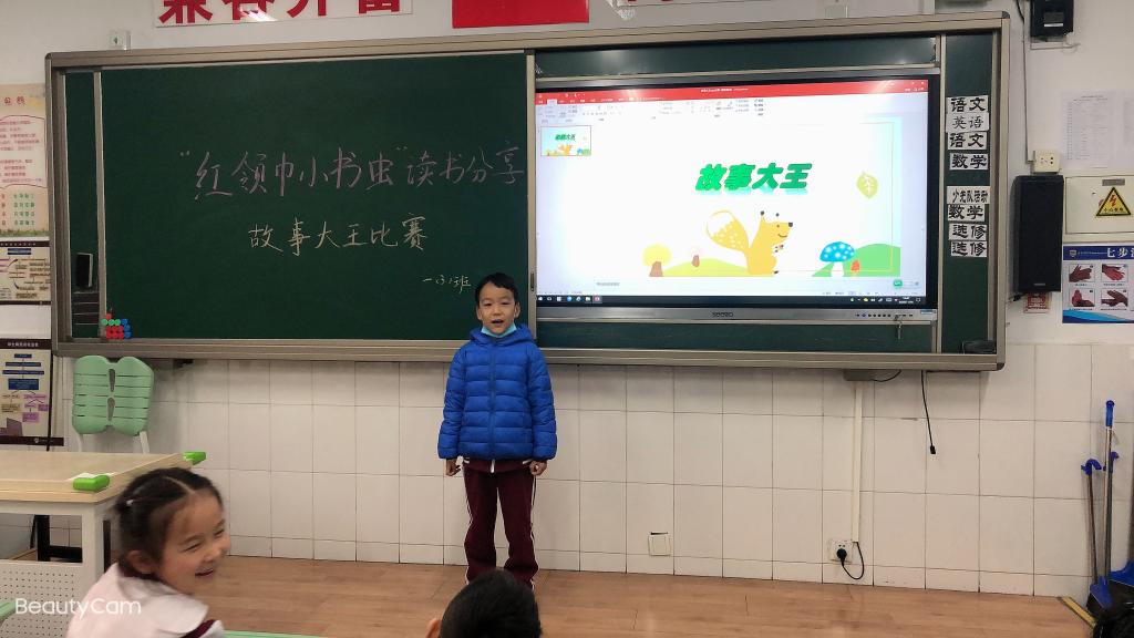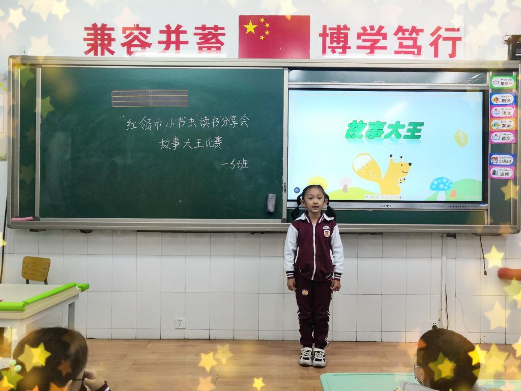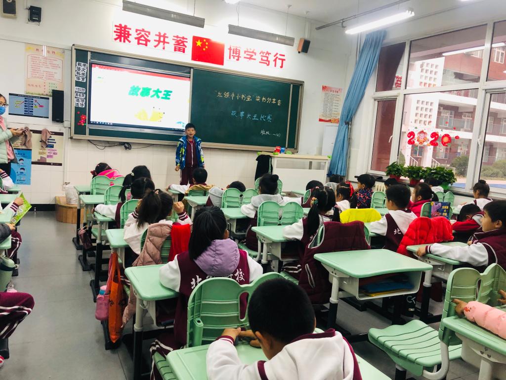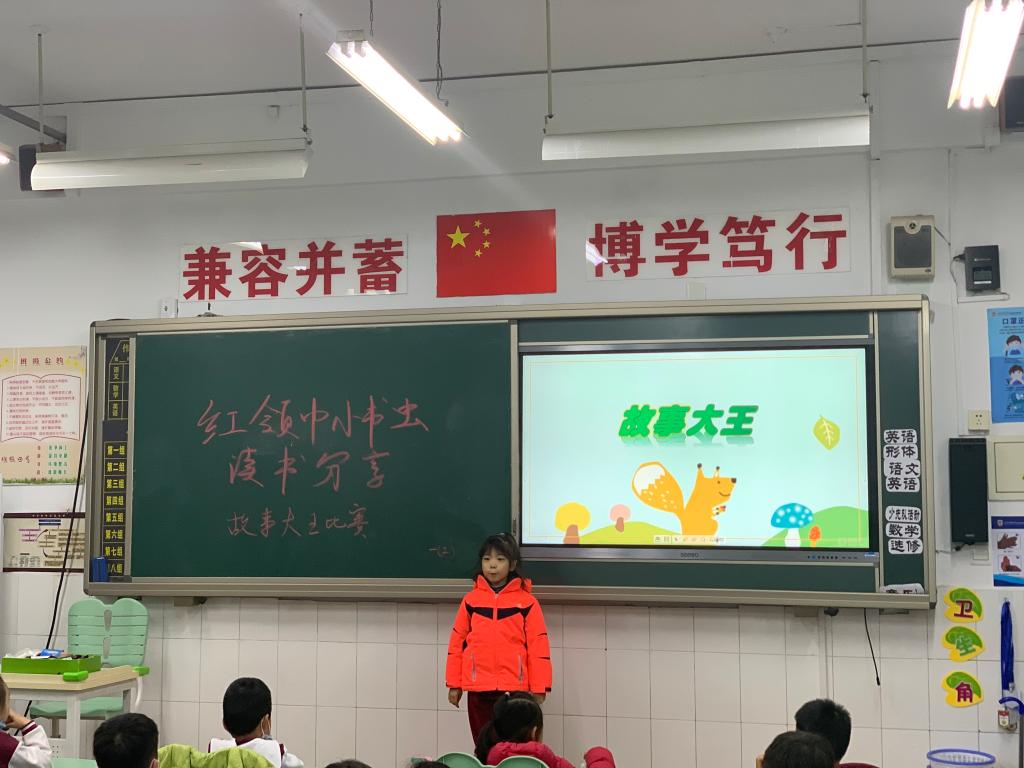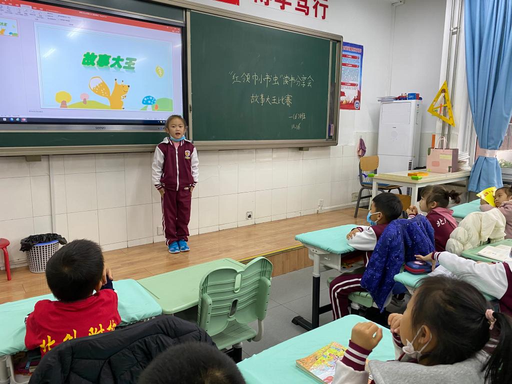 一年级孩子以“故事大王比赛”的方式分享他们喜爱的故事。有的同学讲起故事来滔滔不绝;有的同学则配上动作,幽默十足。从成语故事到神话传说,从名人故事到绘本作品,从寓言故事到国外经典,孩子们把自己喜欢的故事传递给同学们,分享着阅读的快乐与收获。通过此次活动,孩子们收获了自信心,增强了阅读兴趣。