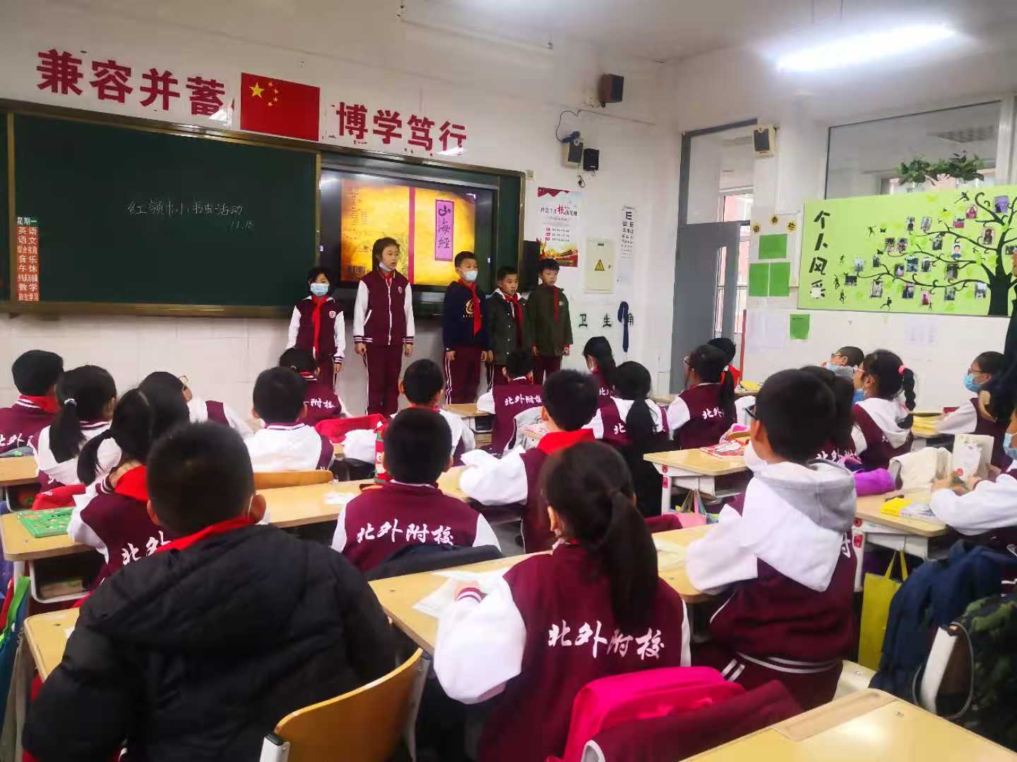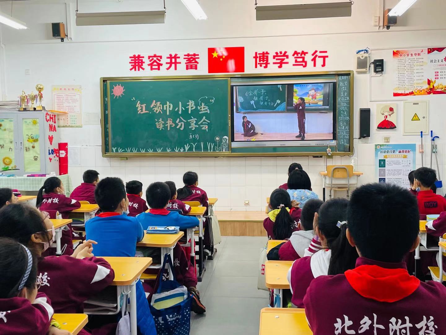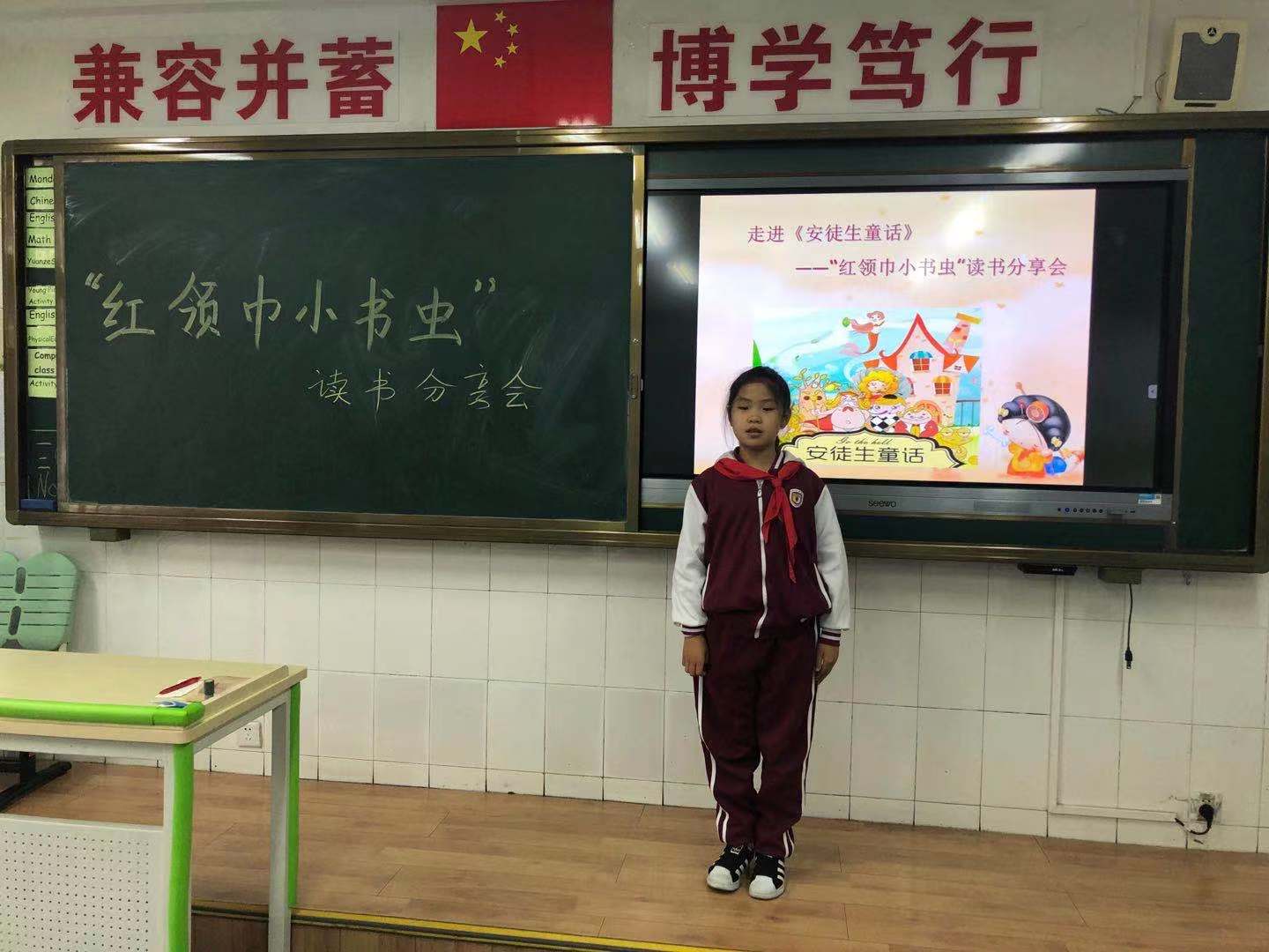五年级红领巾小书虫活动采用“小书虫”读书分享和民间故事表演的形式。五名同学从读书的积累,自身读书的阶段,好书推荐及读书方法几个方面向同学们分享自己的读书经验,使在场的同学受益匪浅。接下来语文老师从各班民间故事展演中推荐五个优秀故事——《白蛇传》、《金斧子银斧子和铁斧子》、《刘墉反穿朝服》、《东郭先生和狼》、《望娘滩》,并播放了制作精良的视频,学生们在欢笑声中感受中国民间故事的神奇与魅力。