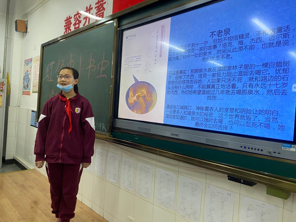 六年级同学积极性高,报名踊跃。分享者与同学们交流了自己阅读的好方法,比如:一本好书要多看几遍;要做到真正融入到书中内容的阅读才能有收获;遇到不明白的词语不要急于查阅资料,可以先接着阅读,在阅读的过程中体会含义等。有的同学分享了一些好书供同学们阅读,分享《红楼梦》的学生从人物着装、人物的命运、有特色的佳肴、语言的细腻等方面向大家介绍这本书,其余同学对此书兴趣高涨。有位同学推荐了许多同学都有了解的《骆驼祥子》,引发了大家热烈的讨论。同学们除了介绍主要情节、人物形象之外,还能在最后总结出书籍带给自己的人生启示,如知恩图报、不要贪婪、诚实守信等等。