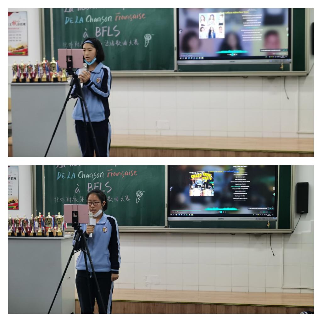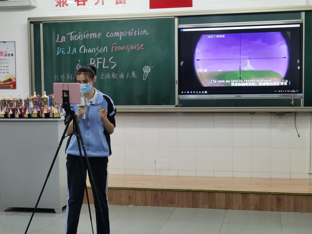 本次比赛分为单人独唱和集体合唱环节,在绽放个人魅力的同时,也展现了学生间的默契感和协作精神。比赛中,金鑫同学选择了法语歌曲《 Au soleil 》,她的歌声婉转清脆,让听众沉醉其中,还意犹未尽便潸然结束;黄羿数同学演唱了法国电影《放牛班春天》的插曲《 La nuit 》,圣洁的歌曲配合天籁般的嗓音,完美再现了电影中空灵清澈的旋律;姚雨桐同学的歌曲《 Top un 》,节奏欢快动感充满律动;齐思涵和张依慧同学用法文翻唱了深受年轻人喜爱的歌曲《时间飞行》,展现出不同于原版歌曲的另一种风格。法语校队学生们集体演唱了《Voie sur ton chemin》,丰富、默契的和声赢得了全班同学的阵阵掌声。