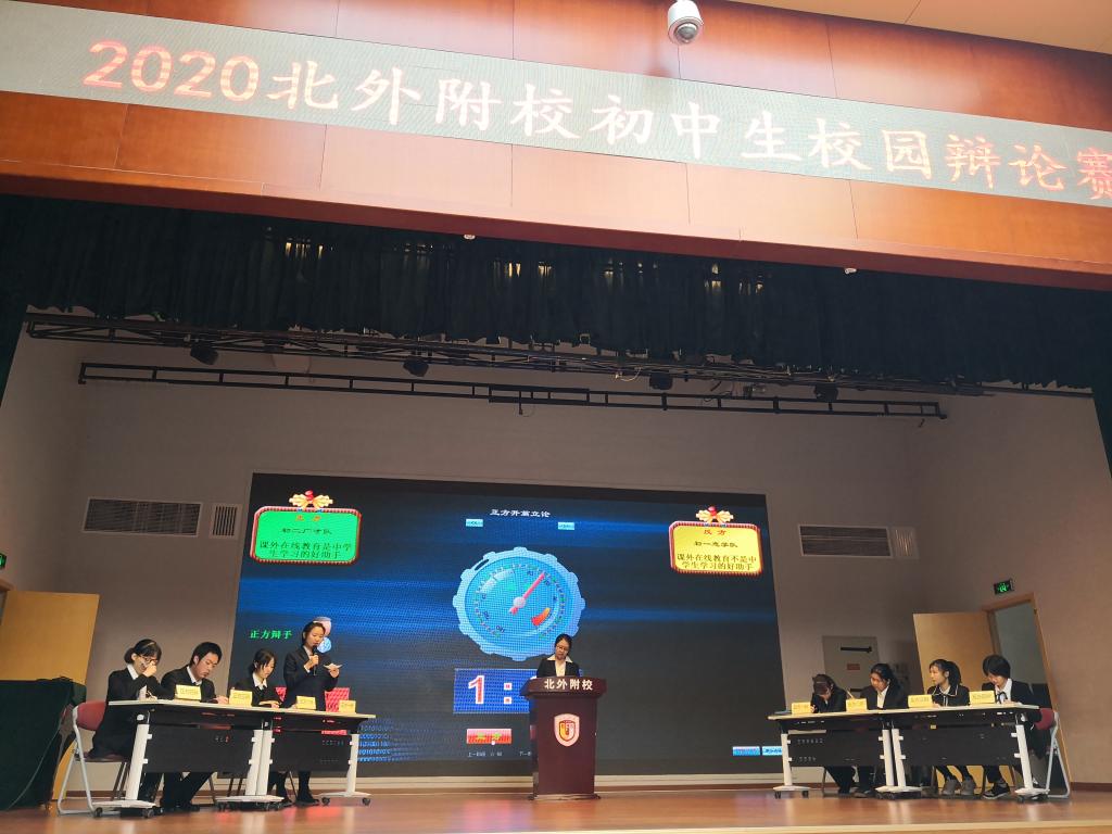 2020年11月19日中午,北外附校初中生校园辩论赛在国瑞厅成功举行。活动由初中教导处联合校团委主办。本次辩论赛特邀塑说教育冉大为老师、初中教导处主任王莉主任、初中教导处副主任于颖主任、语文教研组组长王向华老师、初二年级主任杨礼凡老师、初一年级主任朱强老师作为本次比赛的评委团。