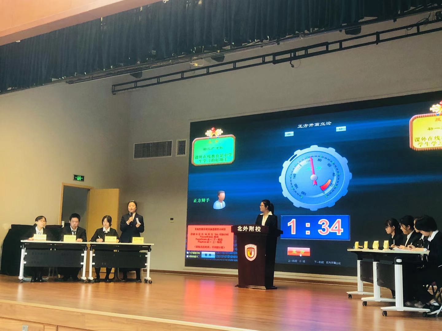 辩论赛围绕“课外在线教育是否是中学生学习的好助手”展开激烈论战。经过前期准备,选手们已经积累了丰富的赛场经验,对辩题的把握十分准确。正方是来自初二年级广才队,他们所持的观点是“课外在线教育是中学生学习的好助手”,反方是来自初一年级志学队,他们所持的观点是“课外在线教育不是中学生学习的好助手”。辩论赛分为开篇陈词、攻辩质询、自由辩论、总结陈词四个阶段。选手们显然有备而来,各辩手思维敏捷,引经据典、旁征博引,正反双方你来我往,唇枪舌战,现场高潮迭起、气氛时而紧张,时而欢快。辩手们用灵活的思维和缜密的逻辑推理赢得了在场观众的阵阵掌声。