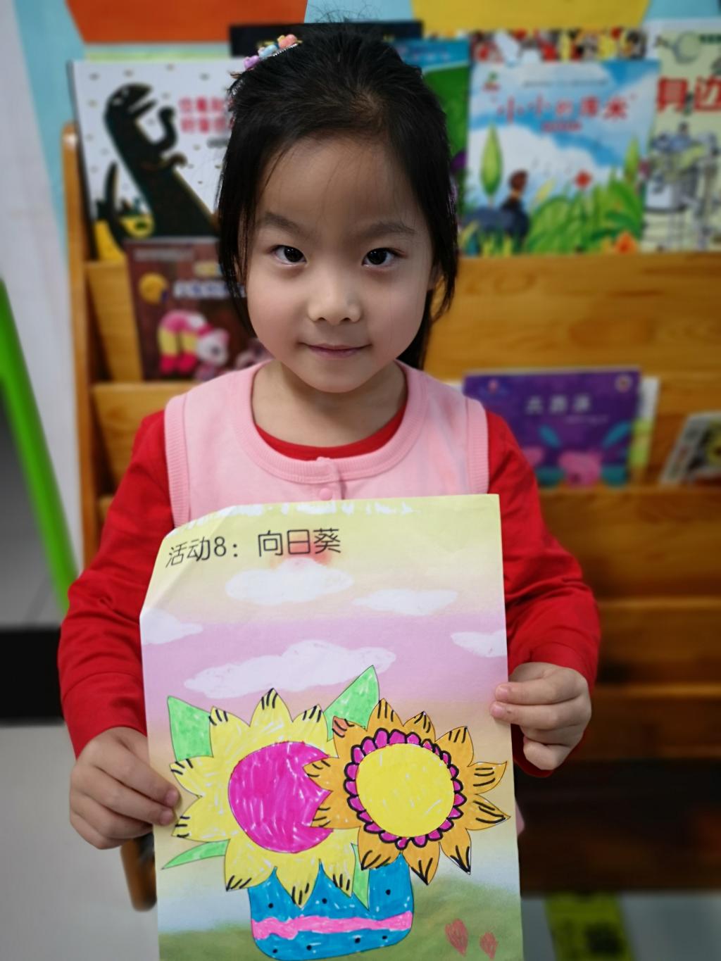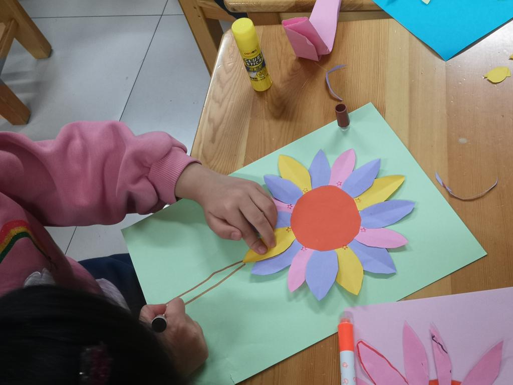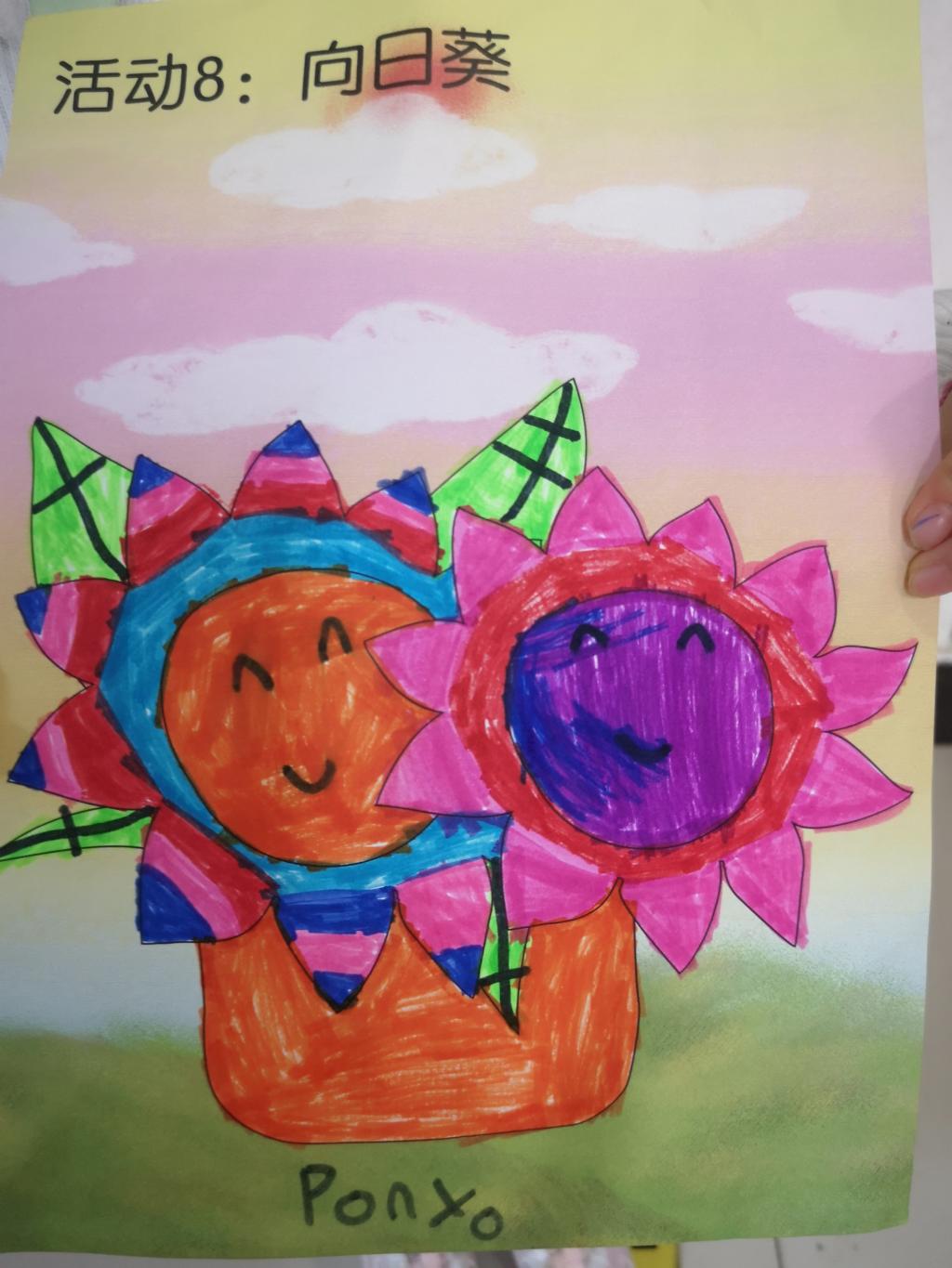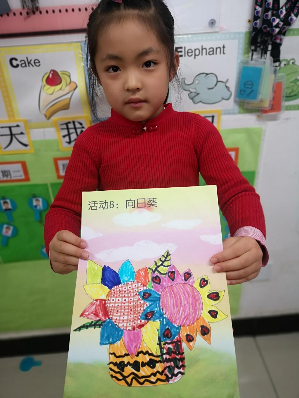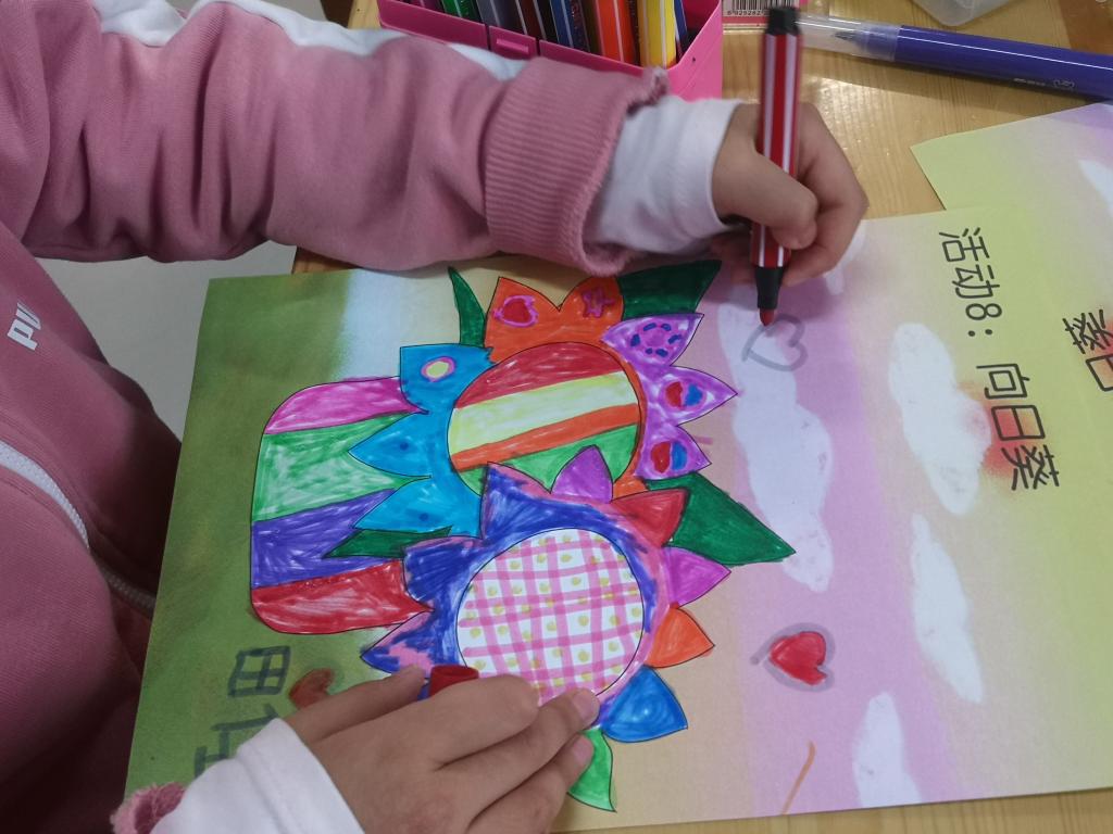 我们预科班的孩子们的向日葵更是色彩缤纷,用绘画和彩纸剪贴的方法制作的向日葵,一定有你喜欢的!有的学生还不会用剪刀,在老师和同学的帮助下完成了制作,孩子们真开心!
