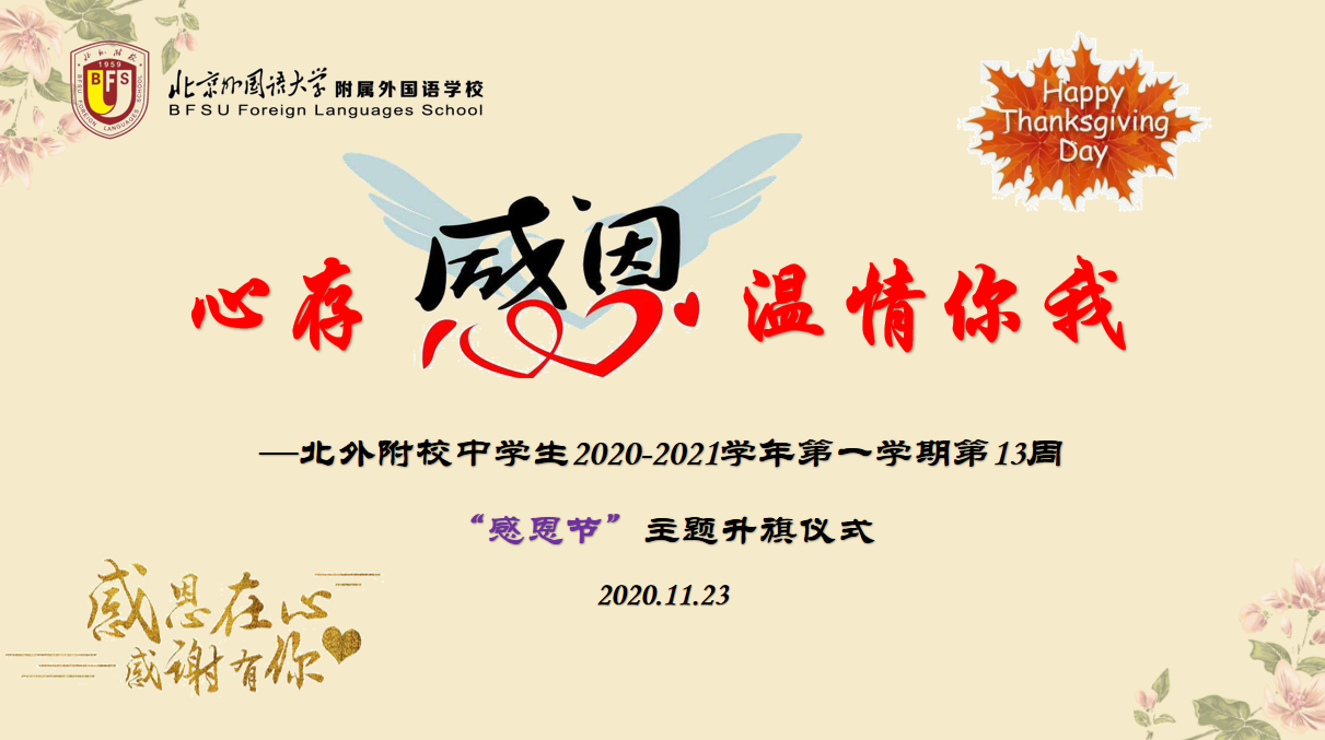 希望同学们行动起来,用一颗感恩的心去生活,积极参与各项感恩活动,现在开始做起,从身边的每一件小事做起,让“感恩情怀”永留我心,让感恩之行出现在校园的每一个角落。希望北外附校的阳光少年们都能怀有一颗感恩的心,一起沐浴着感恩的阳光快乐成长。让我们一起去品味感恩的幸福;常怀感恩之心,共创美好的明天。