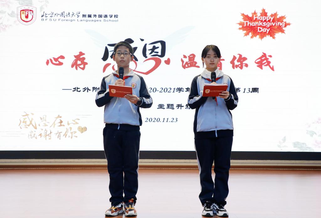 “鲜花感恩雨露,因为雨露滋润了它的茁壮成长;雄鹰感恩天空,因为天空成就了它的展翅高飞;感恩是宝贵的人生态度,是通达的处世哲学,是圆融的生活智慧。感恩是中华民族的传统美德,为弘扬中华民族传统美德,使学生常怀感恩之心,培育学生“感恩文化”,塑造学生的健全人格,养成良好的道德品质和行为习惯,11月23日,我校举行了主题为“心存感恩,温情你我”感恩教育主题升旗仪式。初二(5)班 王泽学、徐思宇担任升旗仪式中英文双语主持人。