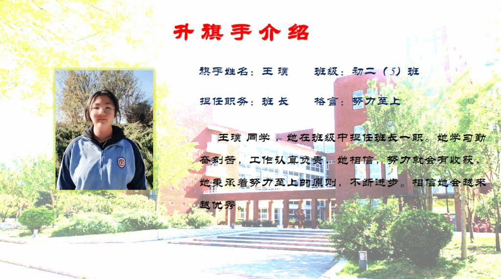 升旗手是王璞同学 ,她在班级中担任班长一职。她学习勤奋刻苦,工作认真负责。她相信,努力就会有收获,她秉承着努力至上的原则,不断进步。相信她会越来越优秀。