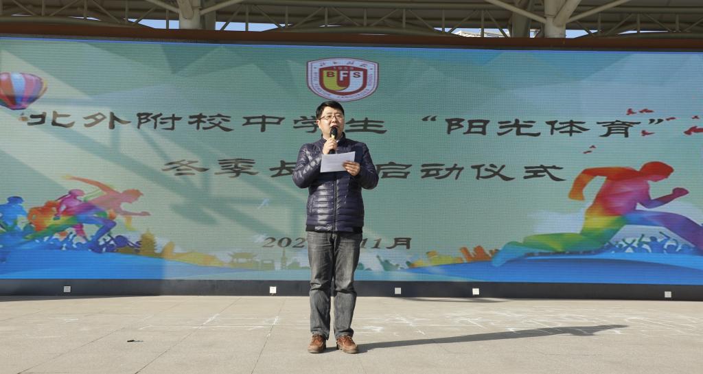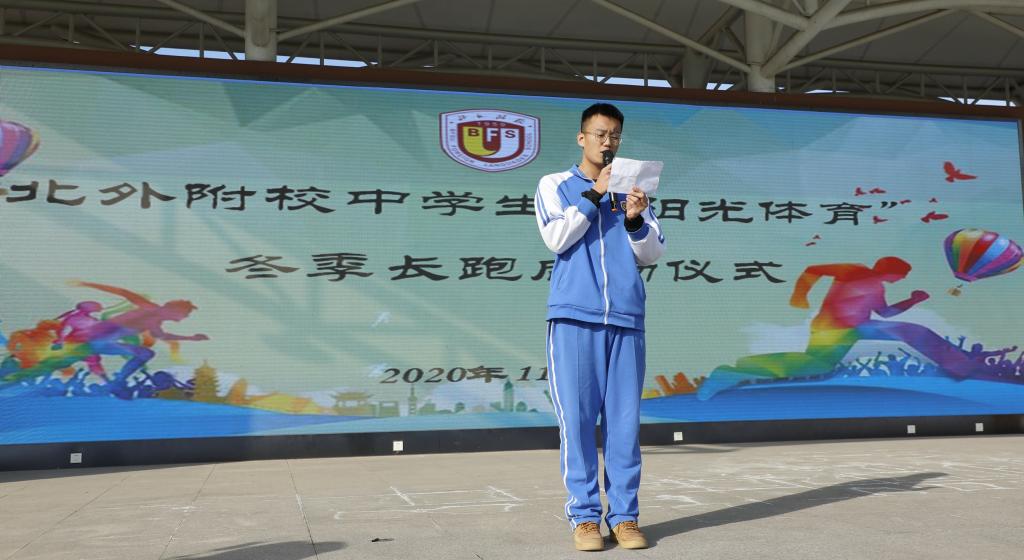 我校副校长,初中执行校长杨磊为长跑启动仪式致辞。他希望同学们都能够积极投入到校园阳光体育的运动之中,努力营造“我运动、我健康、我快乐”的运动氛围,亲身参与感受运动带来的快乐与激情。