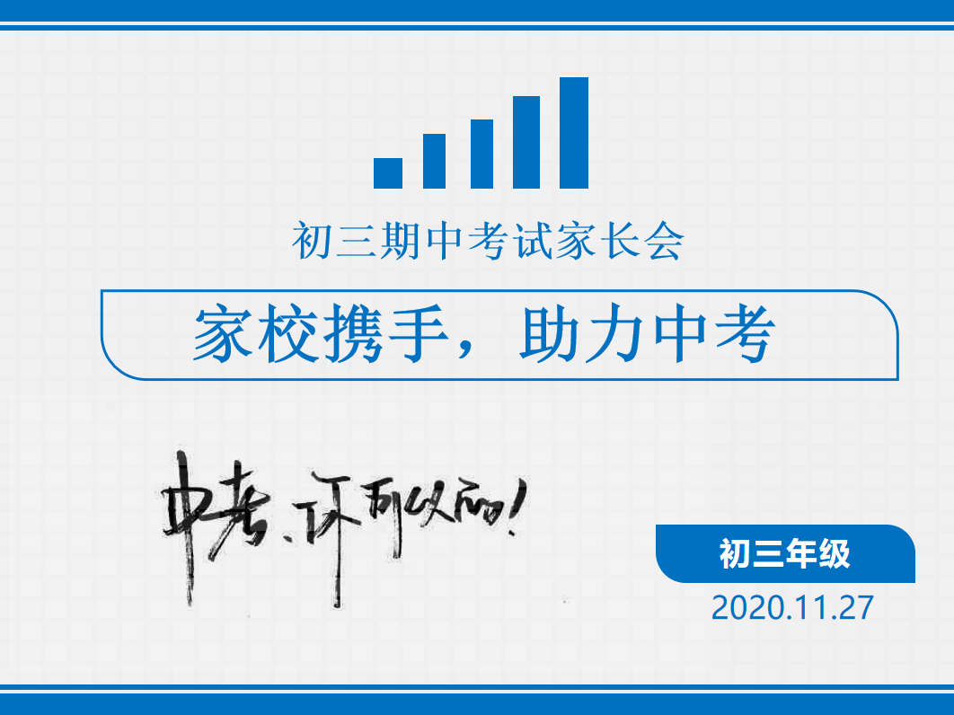 为了进一步加强学校与家庭,教师与家长之间的密切联系,形成家校合力,共同促进学生的健康成长,及时反馈学生近期的学习生活情况,达到家校共育的目的。我校初三年级于2020年11月27日召开了主题为“家校携手,助力中考”的期中总结家长会。