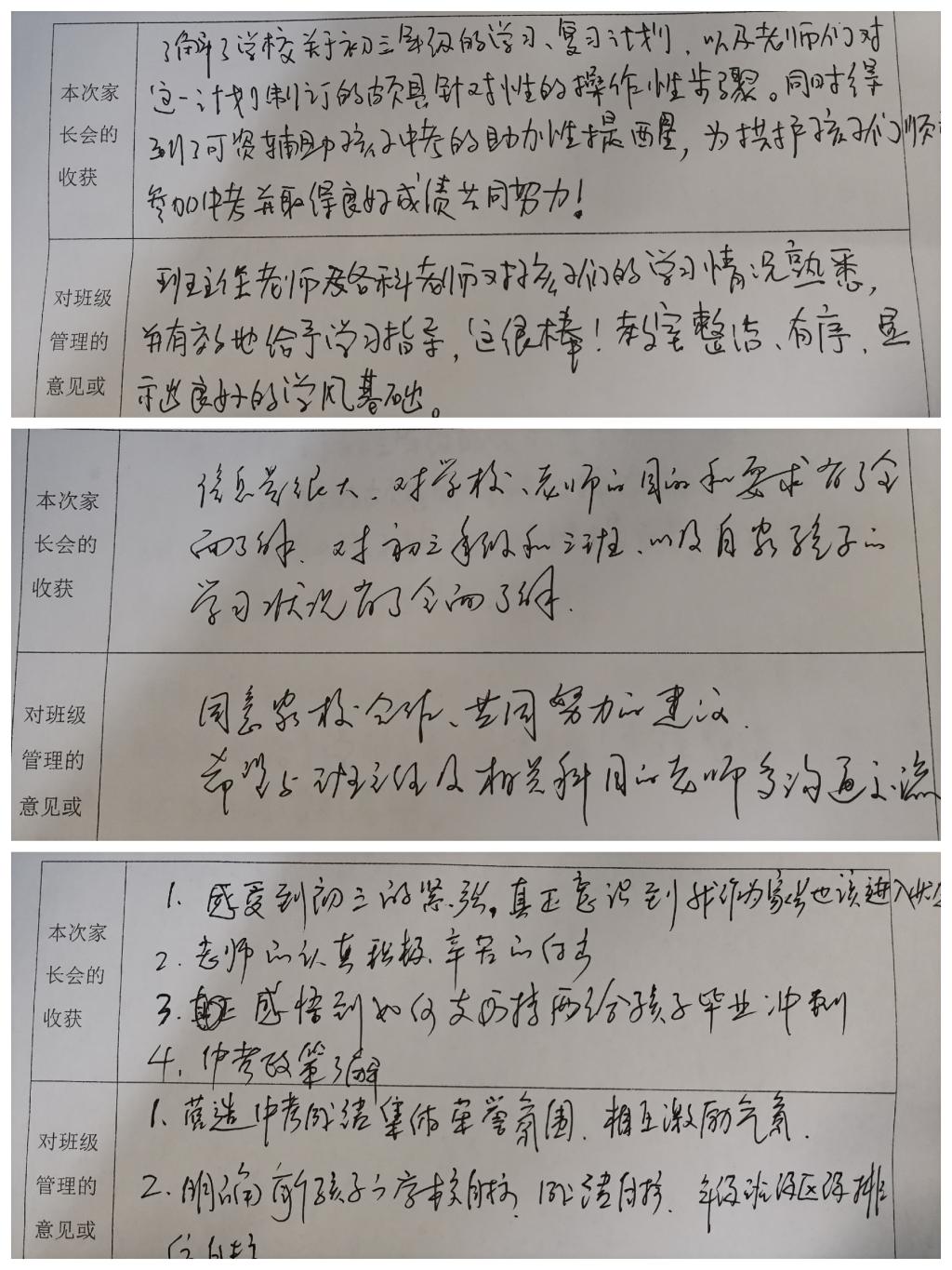本次家长会分两个阶段进行:第一阶段:班级家长会。班主任分别从班级整体情况、地理生物中考成绩、班级期中考试分析、中考政策解读、中考目标制定、英语听说机考备考和初三中考大事记等多方面进行了汇报。数据详实,信息量大,既有备战中考的经验分享,又有实实在在叮咛嘱咐。中途政治、英语和语文任课教师也分别进班介绍了学生在该科目的一些基本情况;同时结合具体的事例告知家长现在的中考怎么考?我们该如何帮助孩子备考?给家长指明努力方向的同时也给出了具体的建议,方法得当,可操作性强。第二阶段:分层家长会。事先班主任和任课老师进行了沟通,罗列出老师这块需要一对一重点沟通的人员名单,然后小窗口通知家长,做到心中有数。同时,结合孩子的具体情况,家长可以选择性的找老师面谈。这样的双向选择针对性较强,会后家长们的反响也很好,达到了理想的效果。