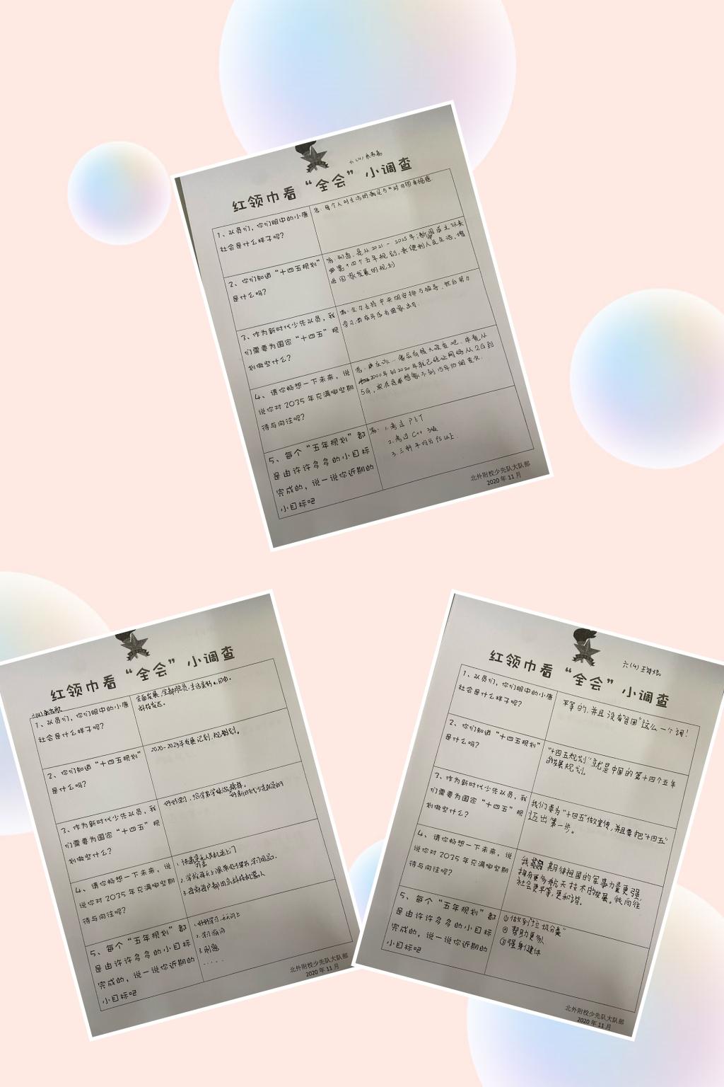 十九届五中全会不仅制定了国民经济和社会发展第十四个五年规划,还提出了2035年远景目标的建议。作为新时代的少先队员,在“十九届五中全会精神”的指引下,可以做些什么呢?队员们在小队内展开讨论,结合红领巾小调查,共同畅想2035年中国的发展变化,并给自己确定了近期的小目标。