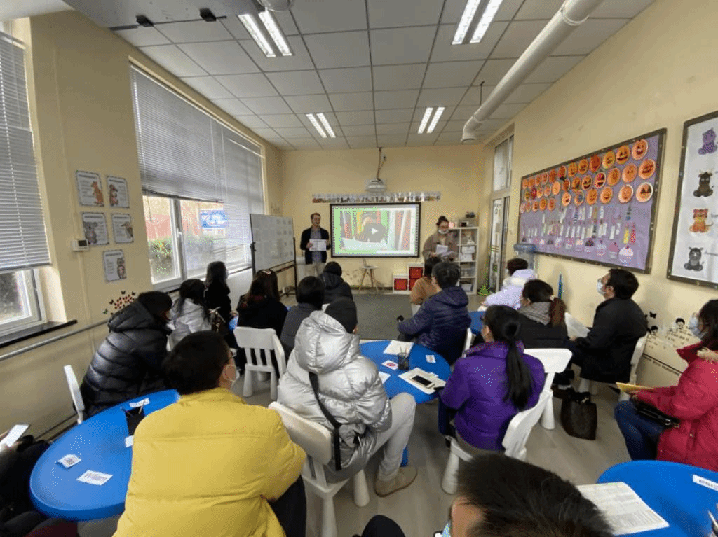 高端英语课程班的外籍教师也参加了本次家长会。他们从教学理念、教学方法、课程组成以及教师对各项技能的培养方式、课堂管理、评价方式等方面做了详细介绍。外教老师还将日常教学活动中所会用到的教学材料和辅助教具向家长进行了展示,让家长们对孩子的学习有了更直接的体验和感受。