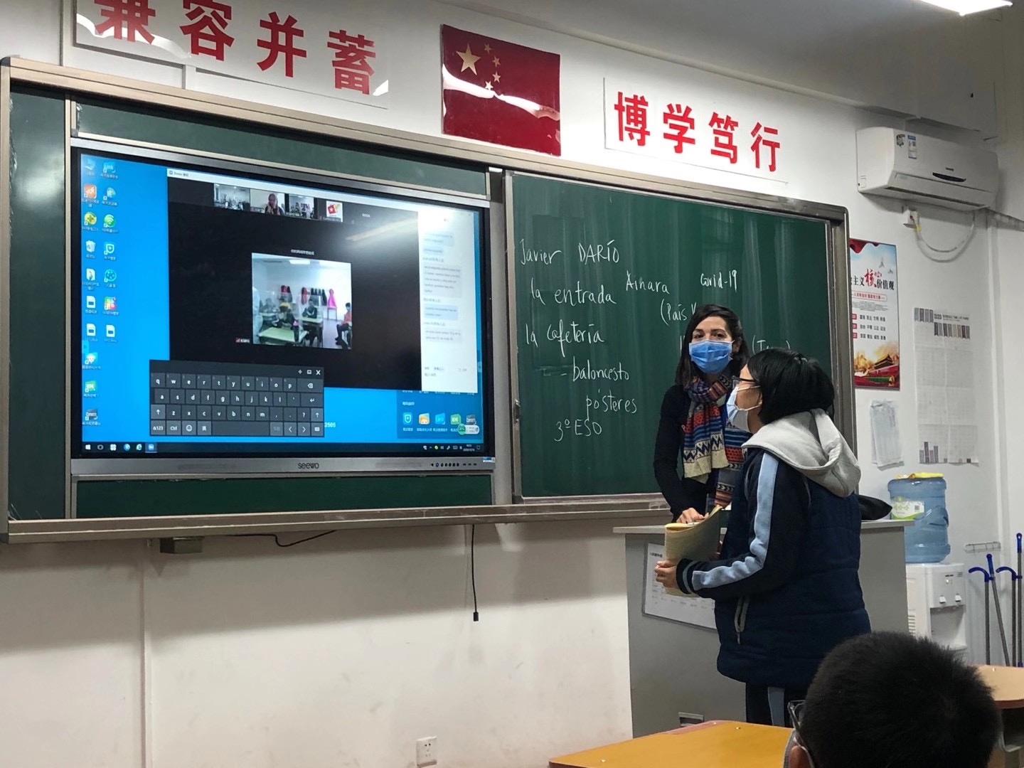 为使我校学生开拓国际视野,进一步了解世界多元文化,体验中西方文化差异,提升对本国文化的认同感和对他国文化的理解与包容,在新冠肺炎疫情肆虐、游学计划暂时搁置的背景下,经西班牙驻华使馆教育处推荐,12月16日下午,西班牙马德里Blanca Fernández Ochoa学校与我校初二西英复语班共同开展了“云游学”活动。