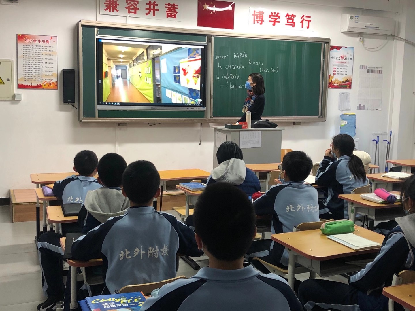 12月初,两所学校的学生分别分组录制了介绍自己校园的视频。我校学生为视频录制做了充分的准备:查阅资料、请教外教、认真准备文稿、反复朗读并进行背诵。随后,学生们利用西语课时间,用流利的西班牙语分别对我校的教室、阶梯教室、机房、图书馆、操场、食堂、体育馆、游泳池等场所进行了创意录制,并给视频配上了中西双语字幕。视频制作完成后,两校学生交换视频,分别提前观看了对方校园的介绍视频。