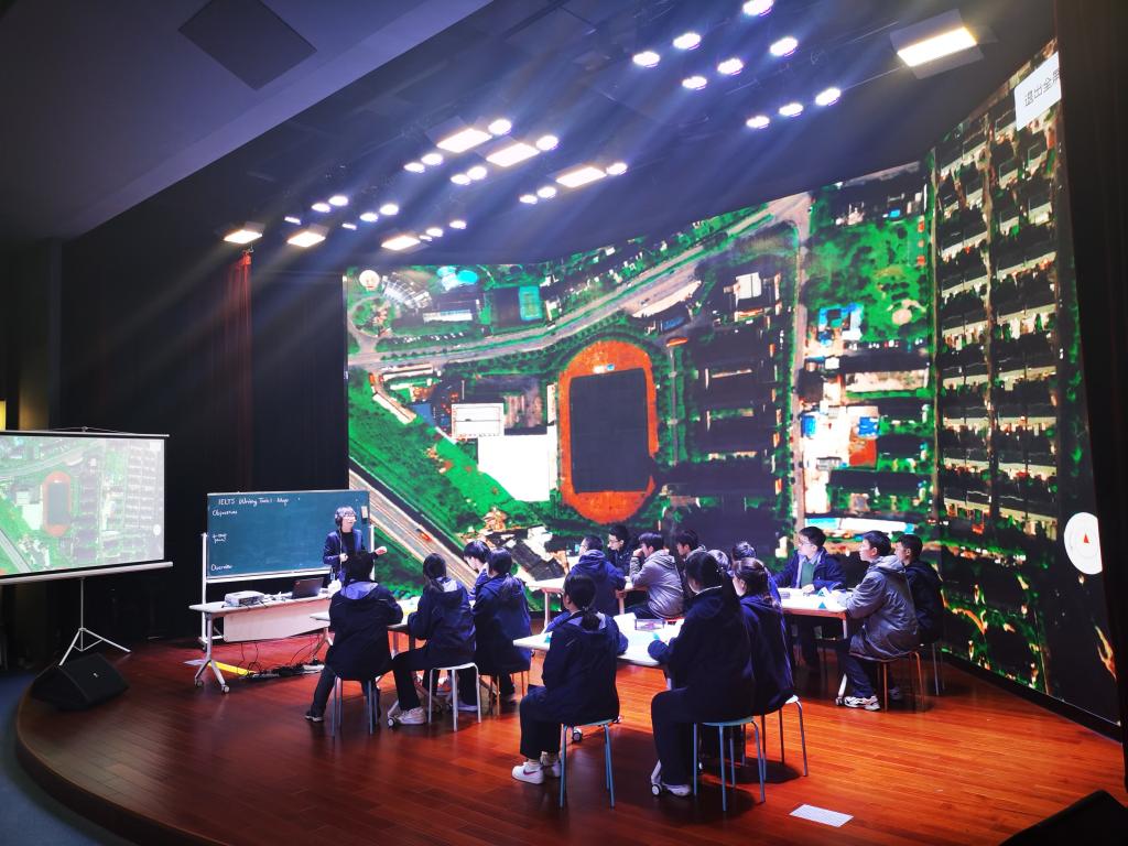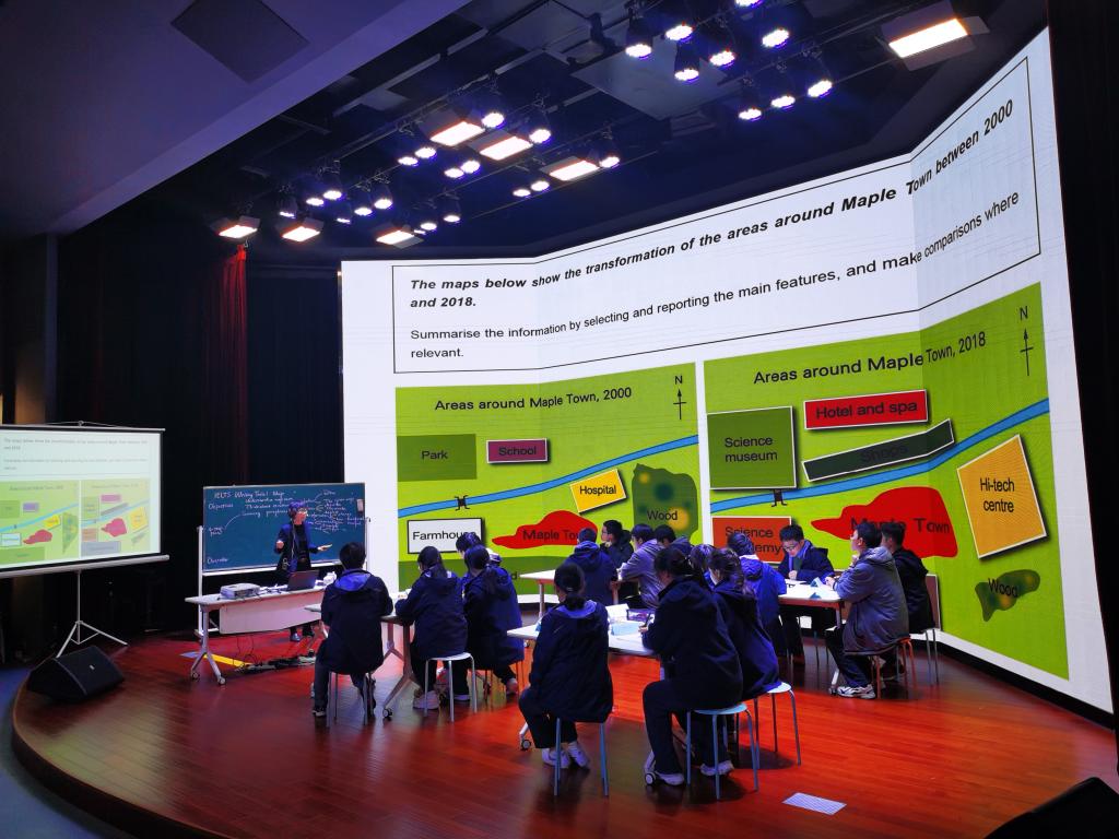 首先,史芳通过一张英特校园的地图自然地引入了地图题写作这一课堂主题,并在无形中拉进了与学生之间的距离,消除了陌生感。随后,史芳给学生们仔细讲解了开头段的写法,她精心设计的板书清晰明了。在主题段落写作训练中,史芳同样采用小组合作的方式让学生抓取主要信息并思考描述的先后顺序,使原本枯燥的写作课变得引人入胜。虽然整堂课信息量大、任务繁杂,但史芳运用“4步计划”使学生逐步达成各项学习任务并在今后面对地图题时也能够更加从容和自信。作为博士,史芳本人严谨的教学思路和出色的语言能力也为其他与会成员留下了十分深刻的印象。
