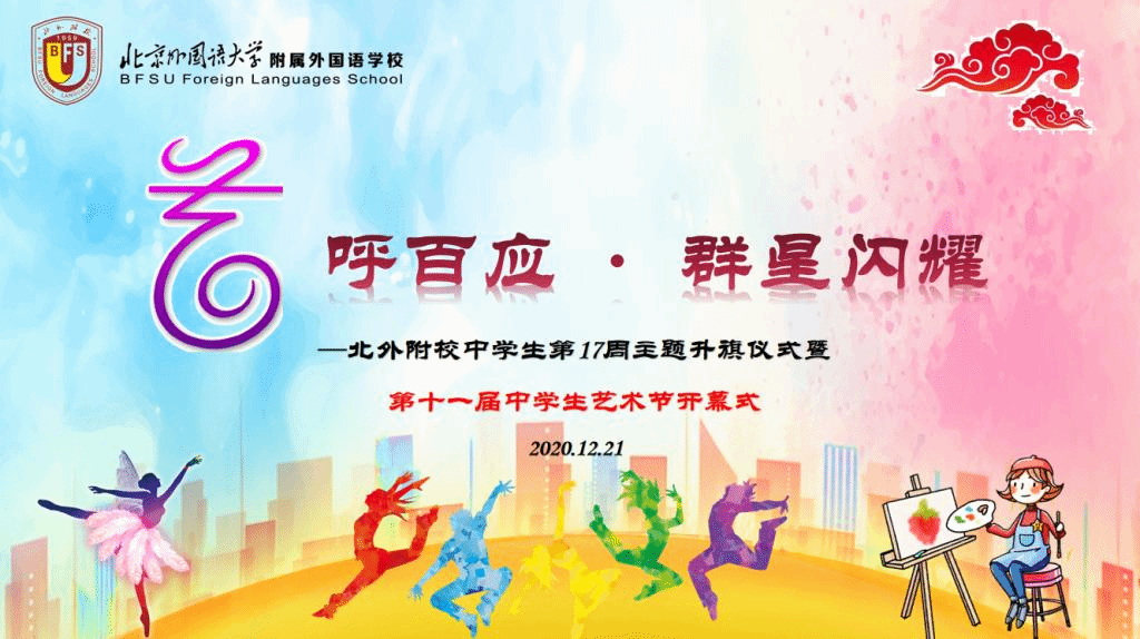 绚丽的灯光,我们翩跹起舞;宽广的舞台,我们尽情展示;多彩的北外附校,海纳百川,万容才华。校园文化艺术节是我校全面贯彻教育方针,加强校园文化建设的重要阵地,也是学校素质教育取得丰硕成果的展示。希望同学们在参与艺术的活动中体验艺术学习的快乐、感受文化艺术的魅力,展现新时代有朝气的新青年形象。