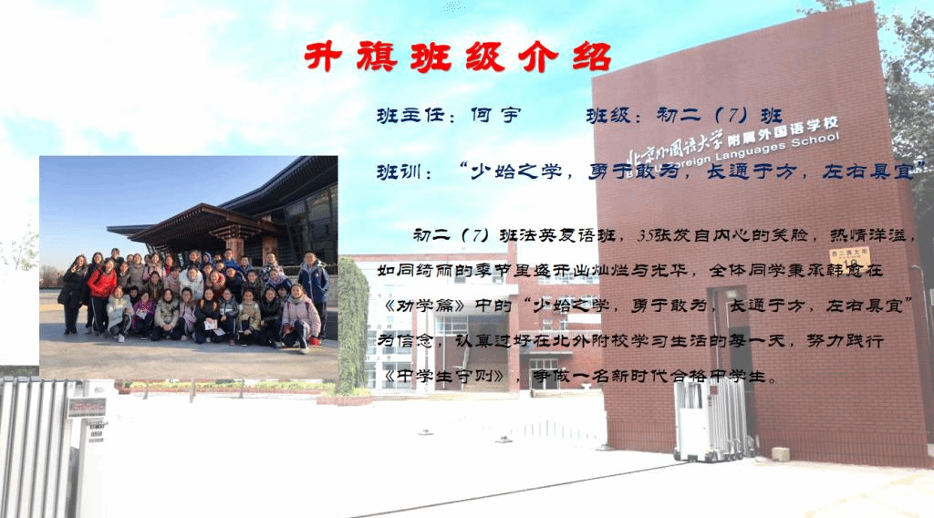 担任本周升旗的班级是初二(7)班法英复语班。35张发自内心的笑脸,热情洋溢,如同绮丽的季节里盛开出灿烂与光华,全体同学秉承韩愈在《劝学篇》中的“少始之学,勇于敢为,长通于方,左右具宜”为信念,认真过好在北外附校学习生活的每一天,努力践行《中学生守则》,争做一名新时代合格中学生。