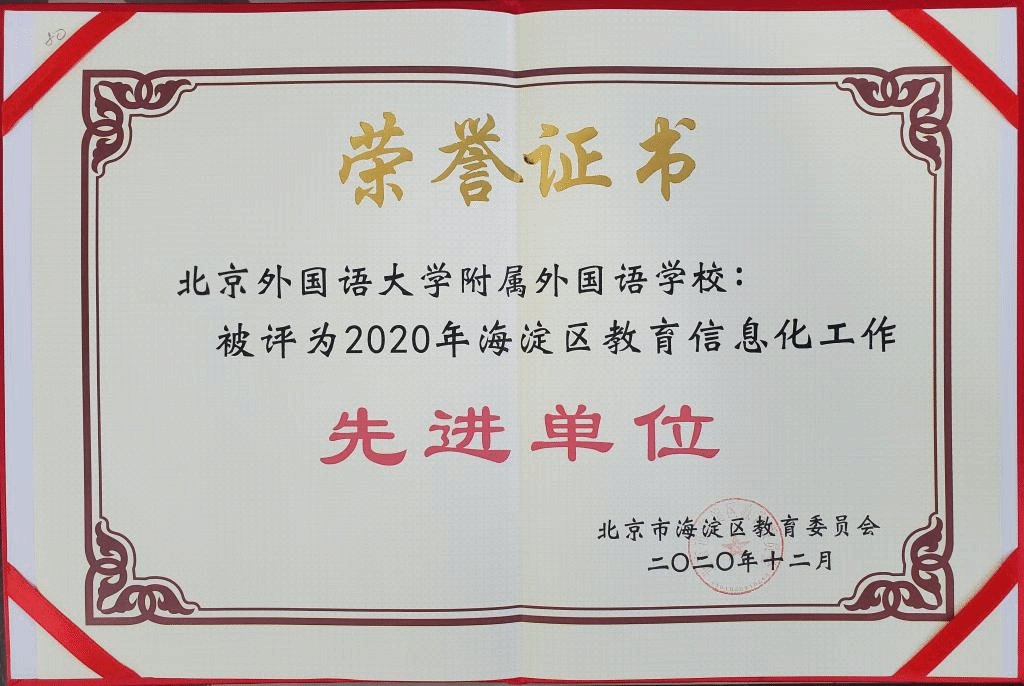 为贯彻落实全国教育工作信息化,发挥典型示范效应,海淀区教委从全区范围内评选表彰教育信息化工作先进集体和先进个人。经过各单位的申报、专家组评审、网上公示等环节,我校被评为2020年海淀区教育信息化工作先进单位。