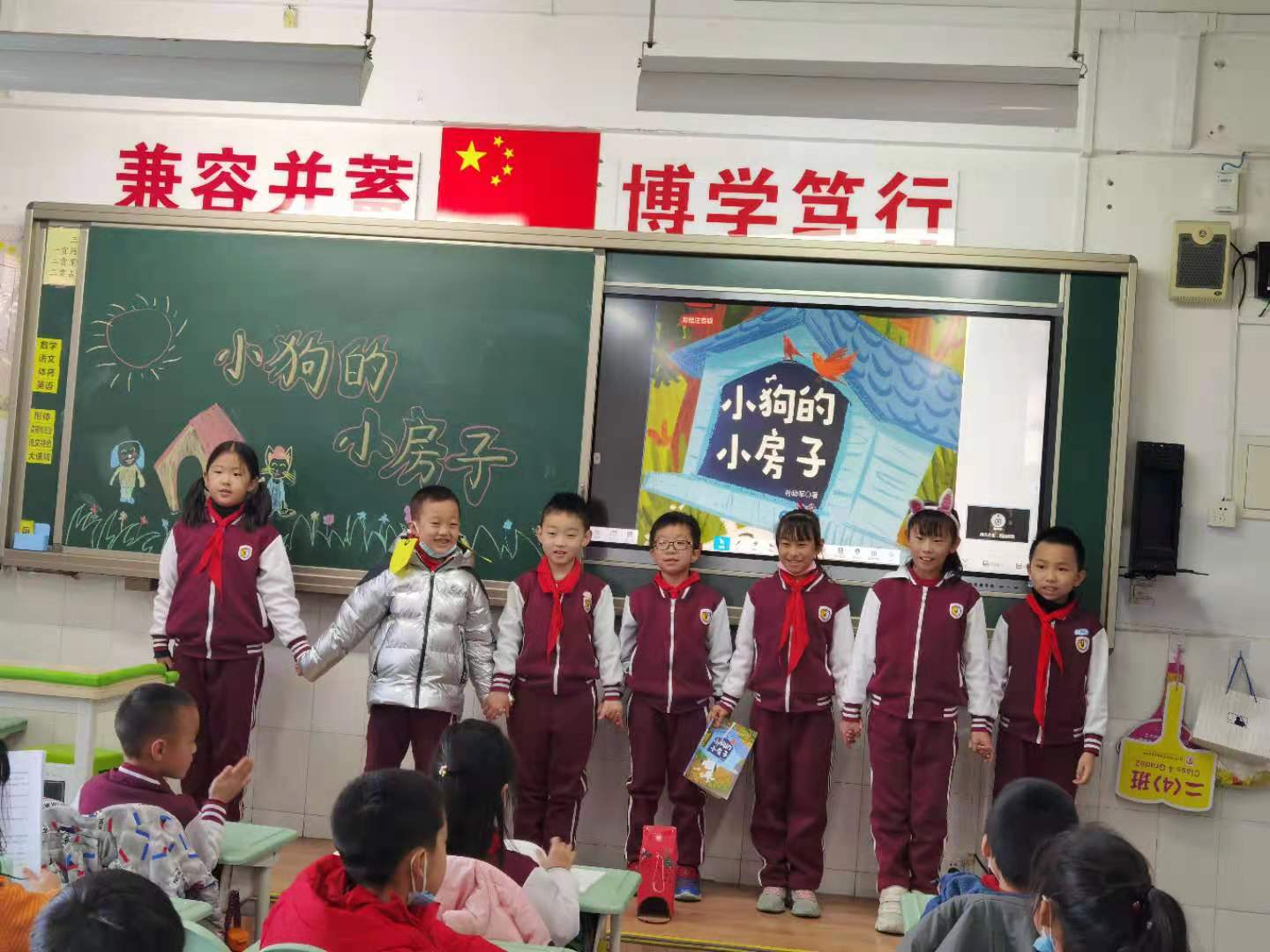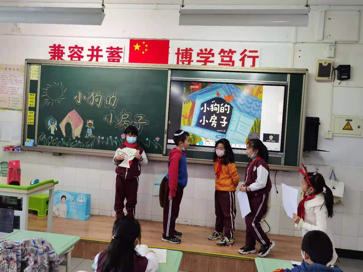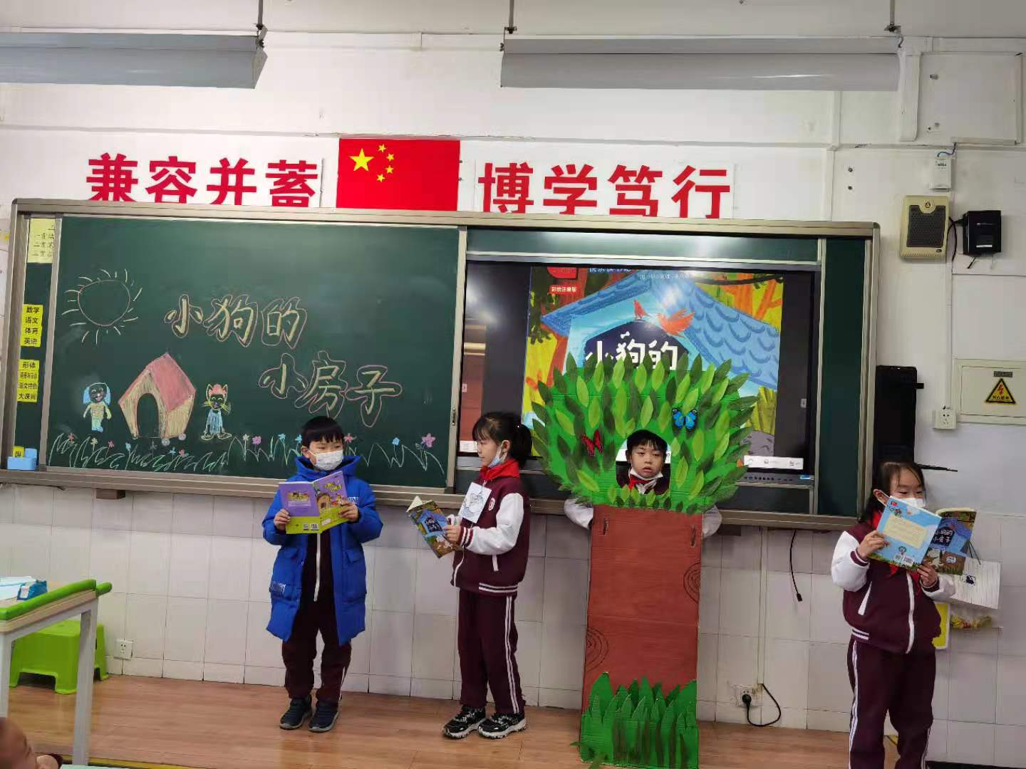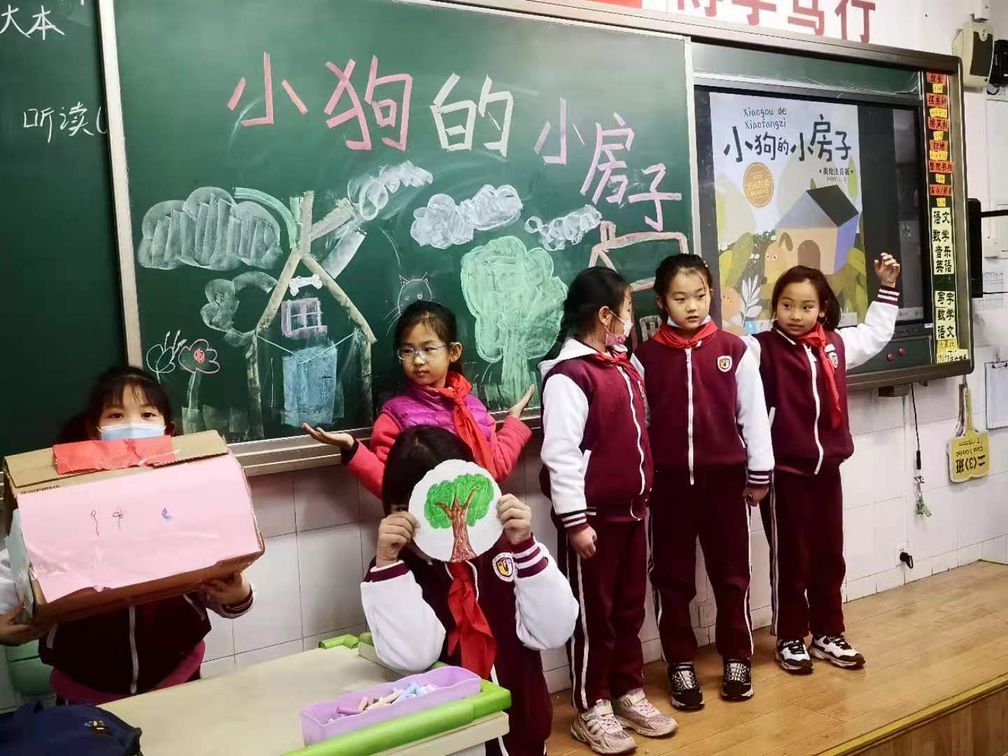 本次活动以绘本剧的形式开展。在老师的精心组织下,孩子们积极准备道具,分组排练《小狗的小房子》中自己认为最有意思的情节。在展演时孩子们表演得惟妙惟肖,有的表演小猫,有的表演女主人,有的表演小房子,班级气氛活跃,孩子们活灵活现的表演不时赢得台下观众的阵阵掌声。