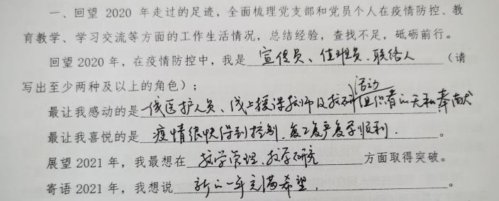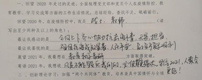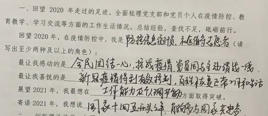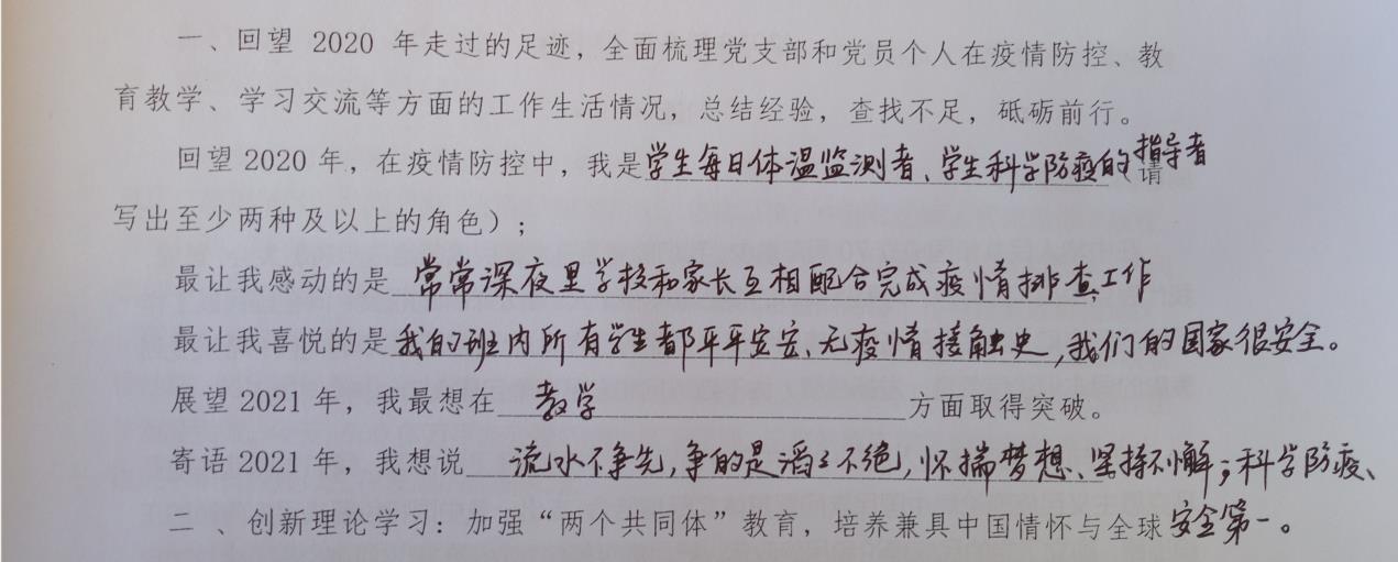 会上,全体党员通过回望2020年走过的足迹,全面梳理党支部和党员个人在疫情防控、教育教学、学习交流等方面的工作生活情况,总结经验,查找不足,砥砺前行。大家敞开心扉,回望2020年,分享交流自己在疫情防控中的角色,以及最让自己感动、喜悦的事;展望2021年,制定目标、突破自我;怀揣美好的祝愿,寄语2021年。