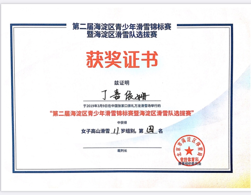 我校丁嘉依姗同学荣获海淀区第二届青少年滑雪锦标赛女子高山滑雪“第四名”