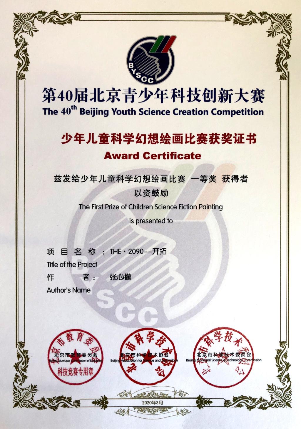 在海淀区中小学生科学幻想绘画比赛暨北京市青少年创新大赛(科幻画)选拔赛中,我校有54名同学荣获海淀区科学幻想画一、二、三等奖,张心檬荣获北京市“一等奖”。
